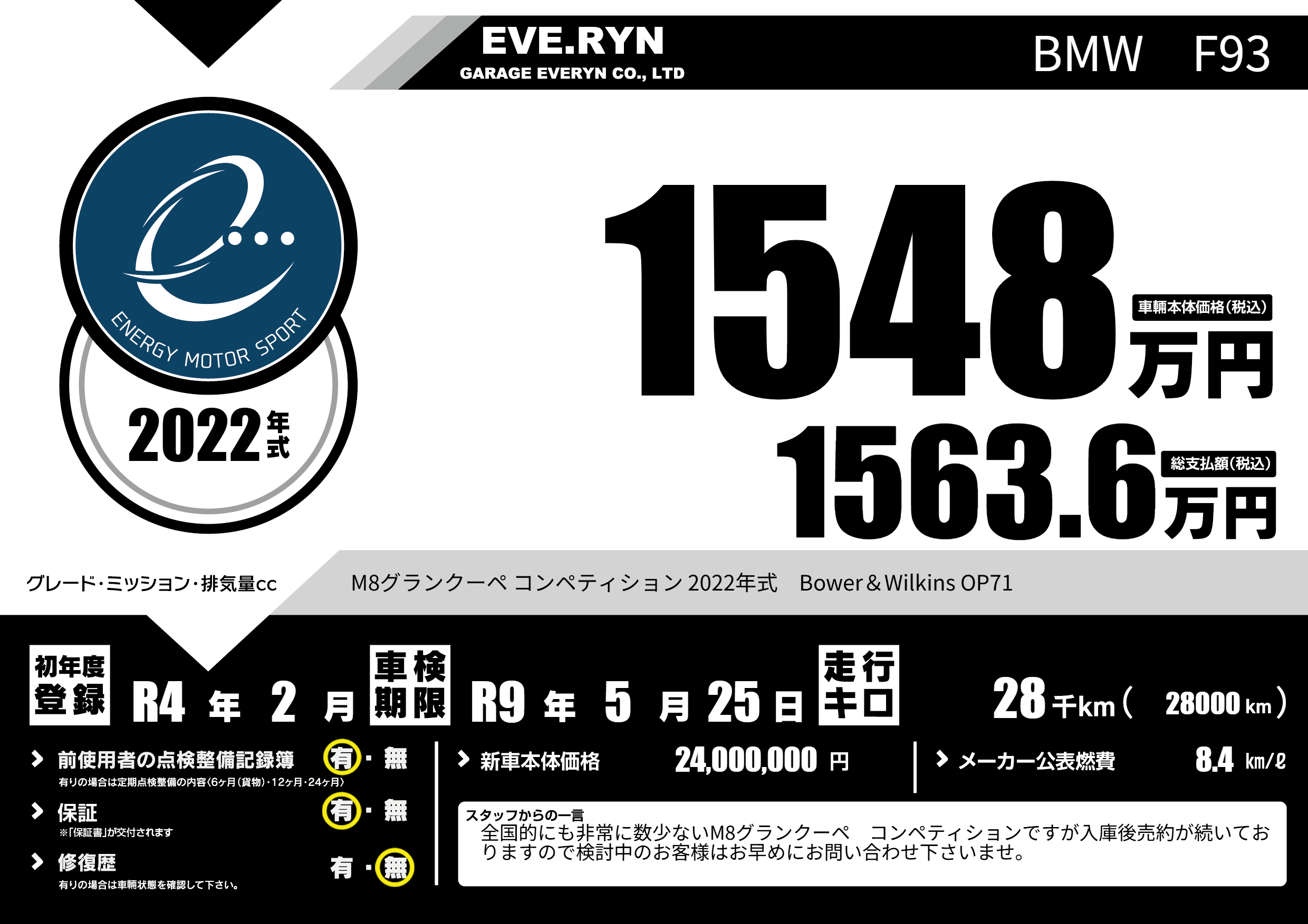 | 車名 | BMW F93 | グレード ミッション 排気量 |