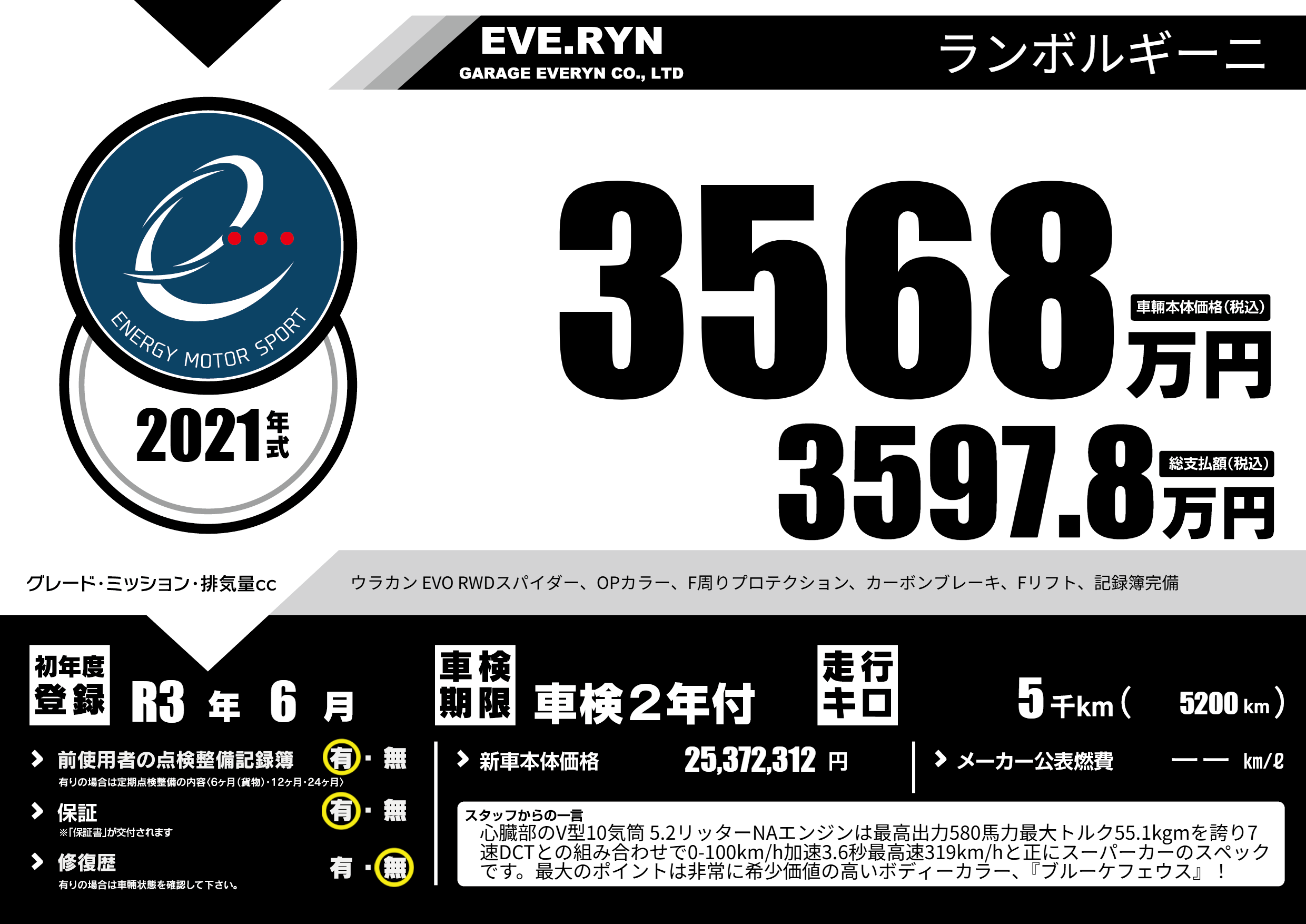 ウラカン EVO RWDスパイダー、OPカラー、F周りプロテクション、カーボンブレーキ、Fリフト、記録簿完備 |