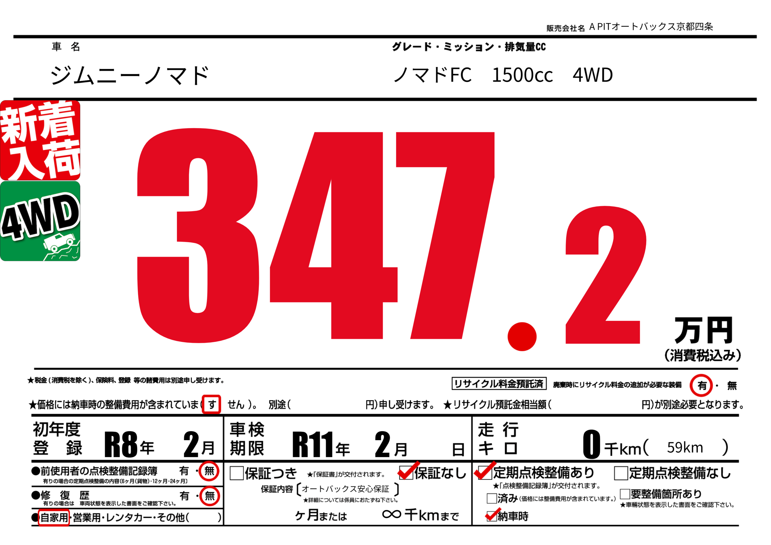 | 車名 | ジムニーノマド | グレード ミッション 排気量 |