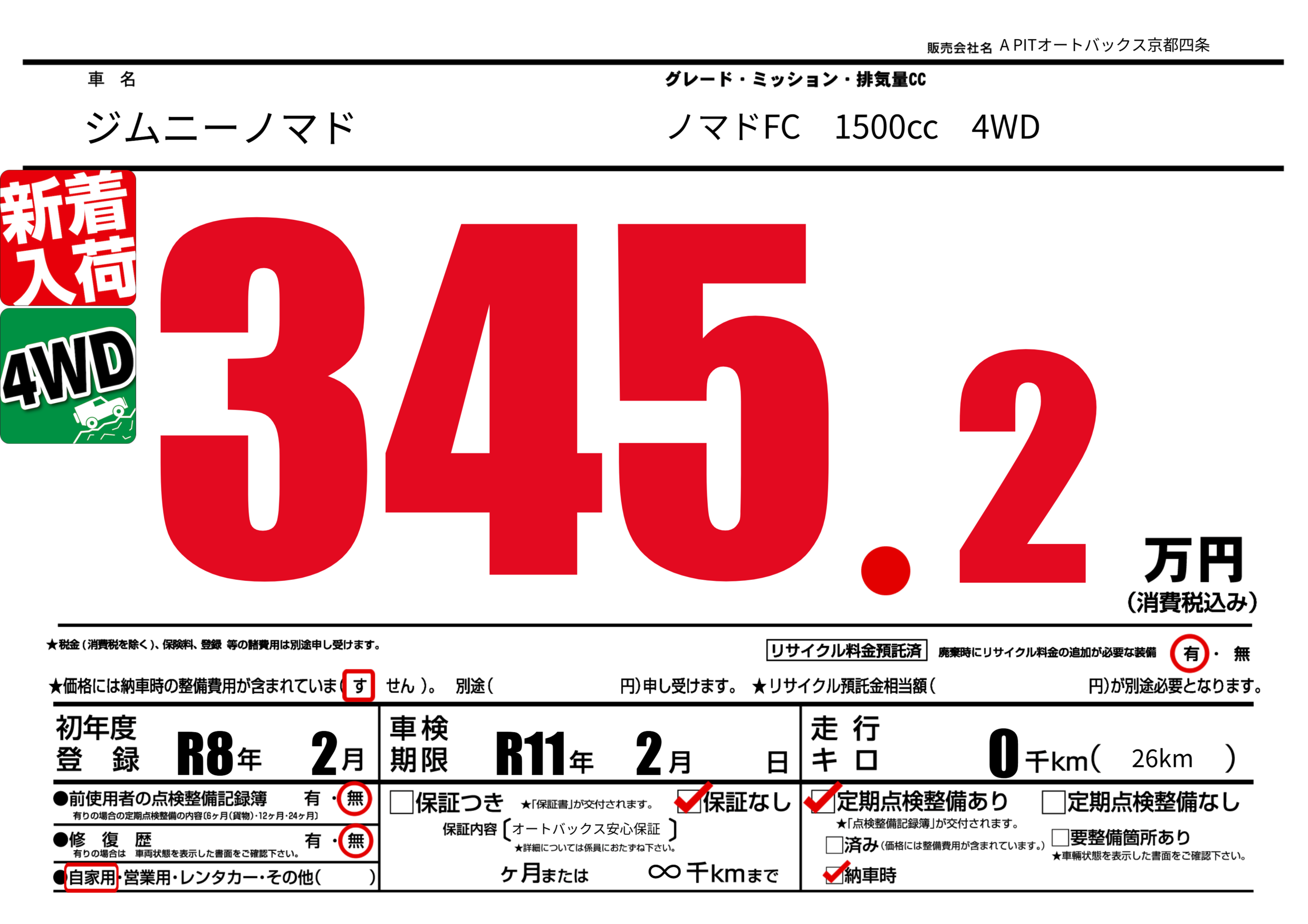 | 車名 | ジムニーノマド | グレード ミッション 排気量 |