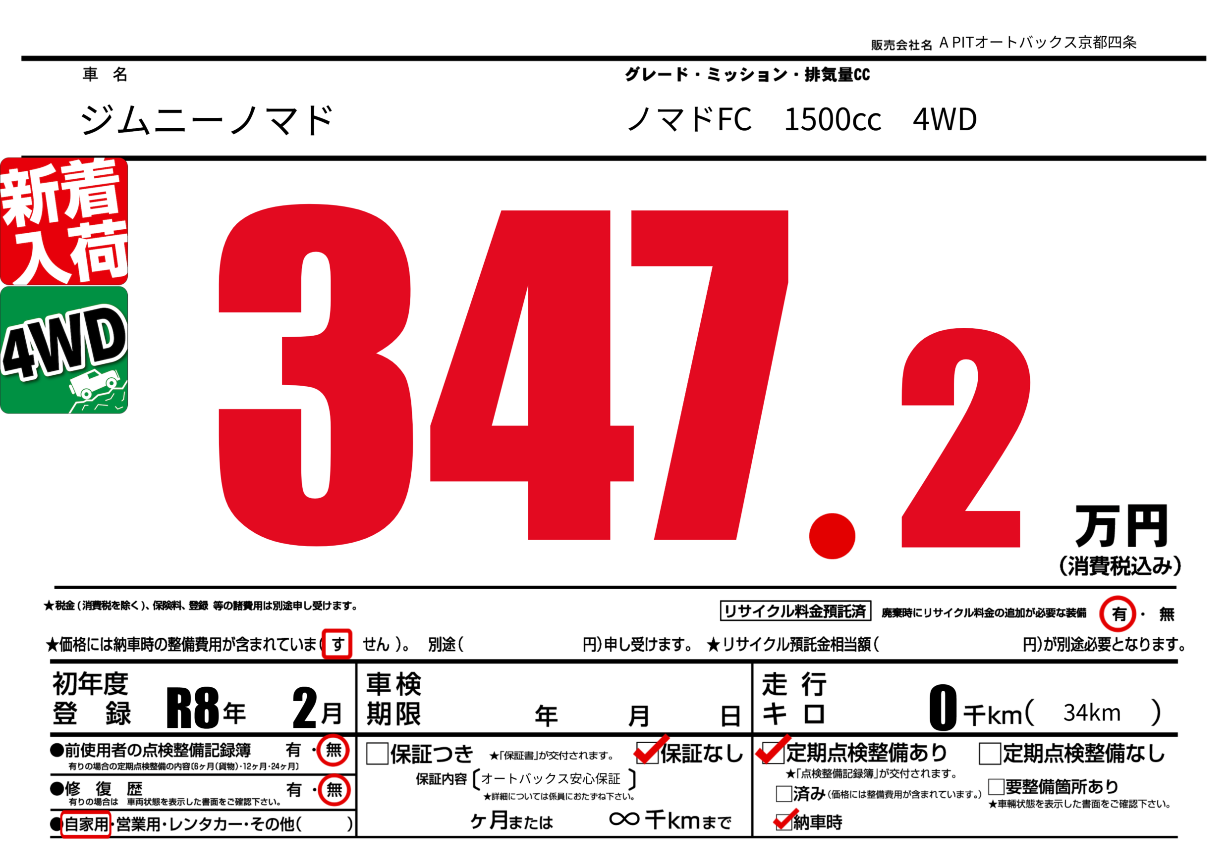 | 車名 | ジムニーノマド | グレード ミッション 排気量 |