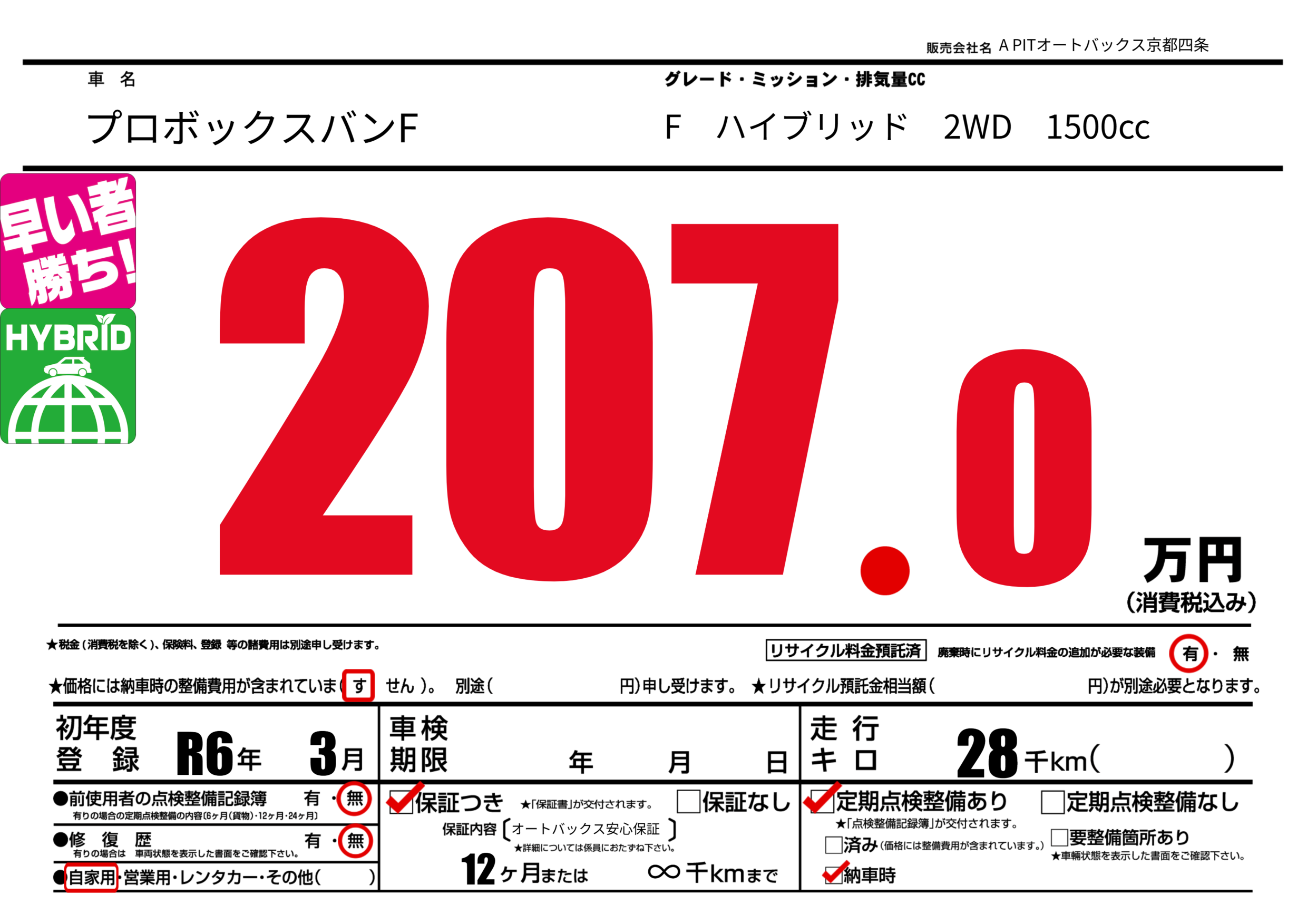 | 車名 | プロボックスバンF | グレード ミッション 排気量 |