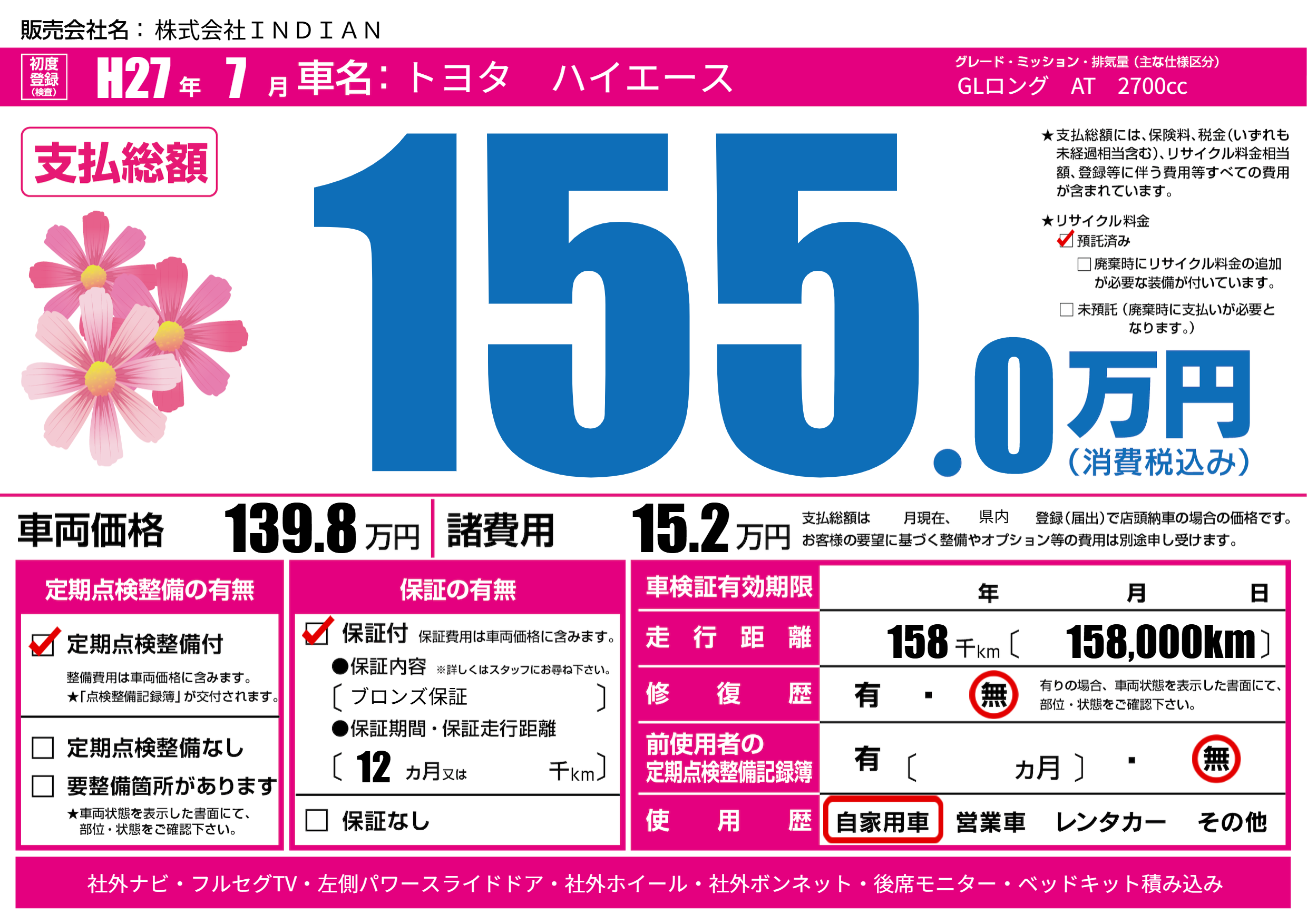 | 車名 | トヨタ ハイエース | グレード ミッション 排気量 |