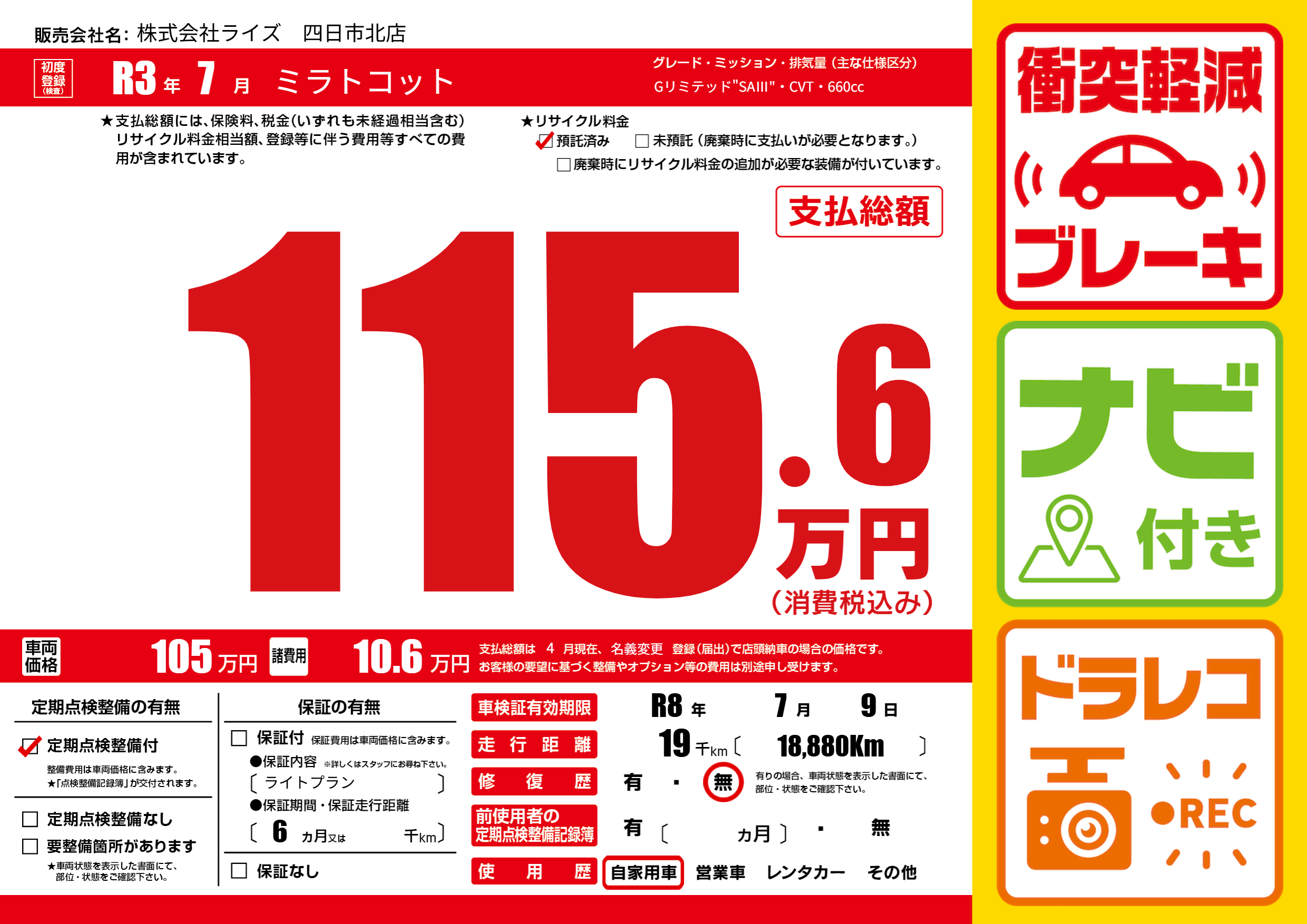 なし | 車検制限 | R8年7月9月 |