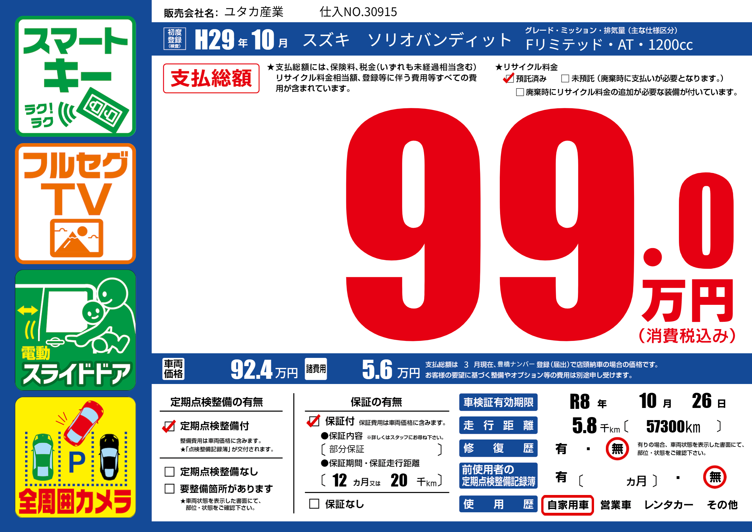| 車名 | スズキ ソリオバンディット | グレード ミッション 排気量 |