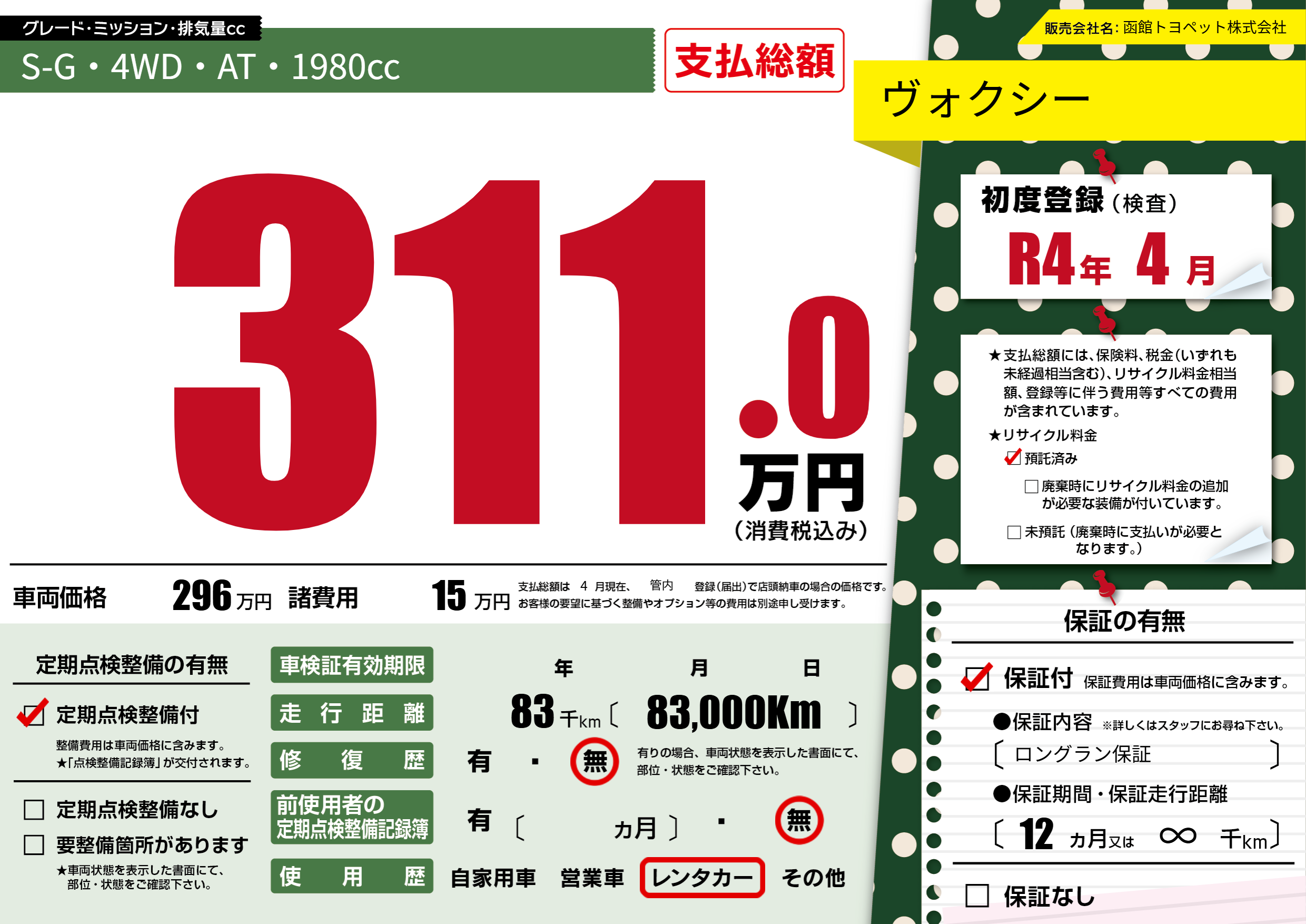 | 走行キロ | 8.3万km | 初年度登録 | R4年4月 |