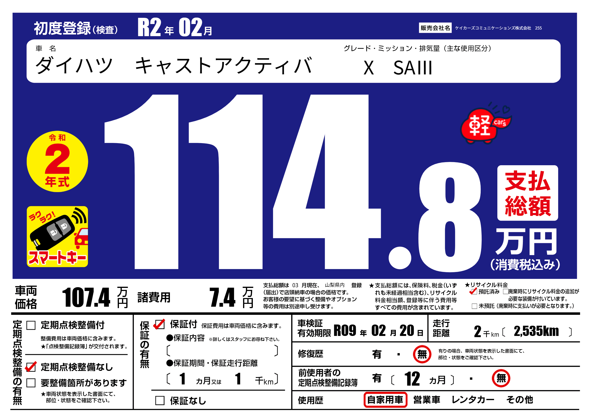 | 車名 | ダイハツ キャストアクティバ | グレード ミッション 排気量 |