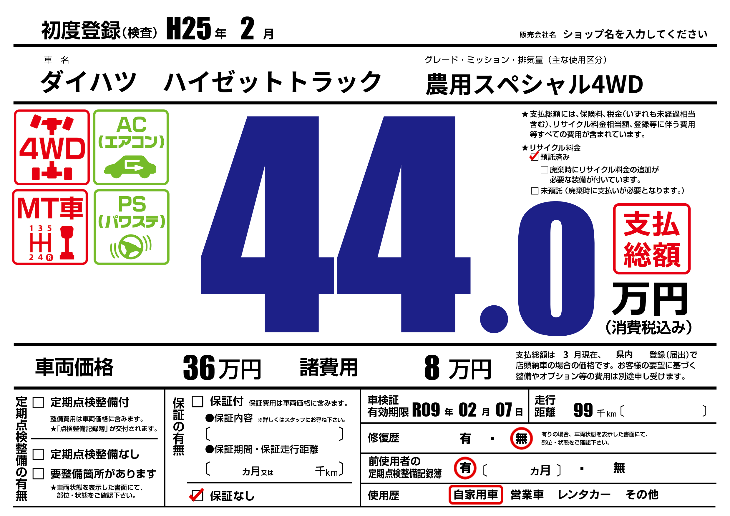 なし | 車検制限 | R09年02月07月 |