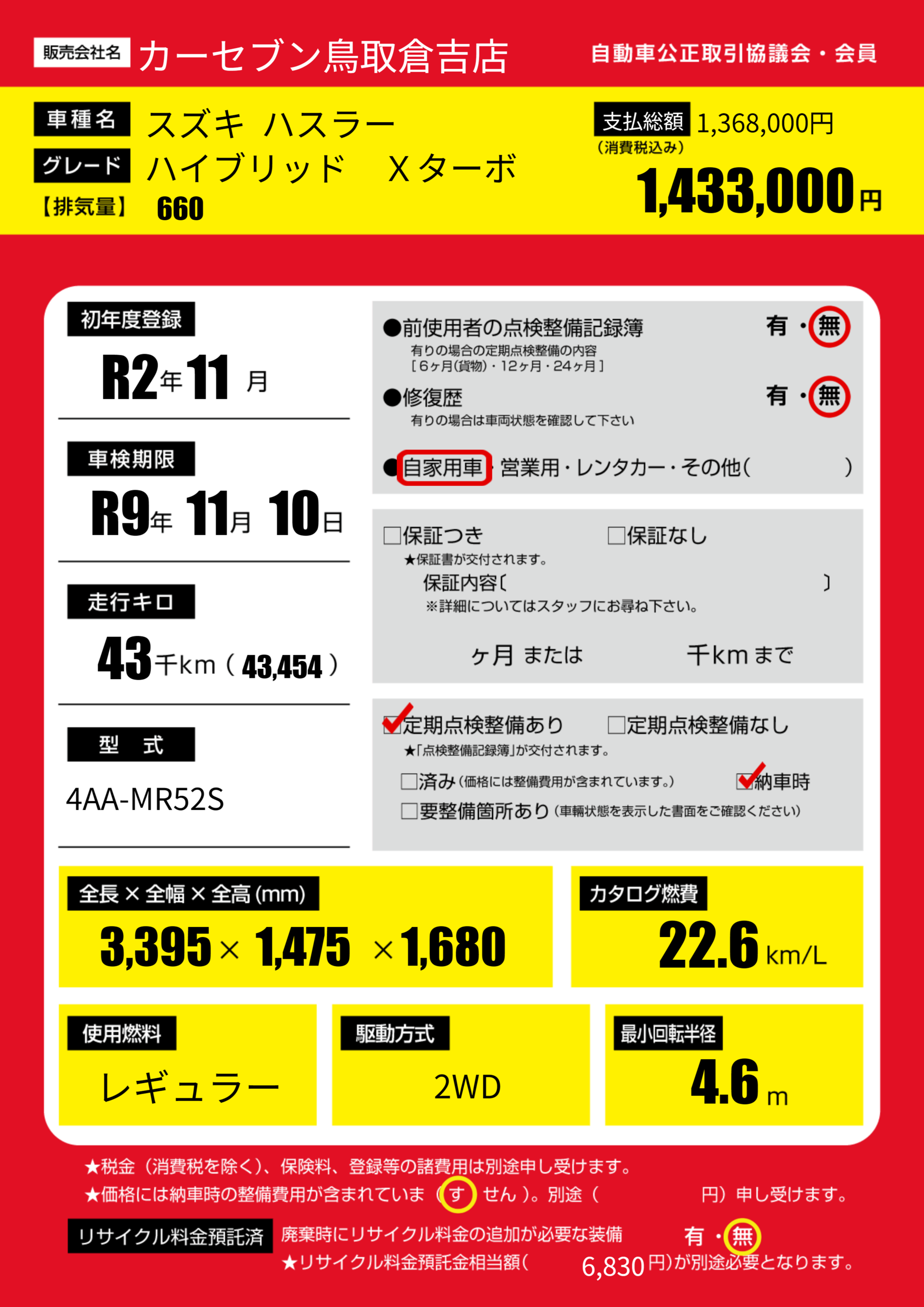 | 車名 | スズキ ハスラー | グレード ミッション 排気量 |