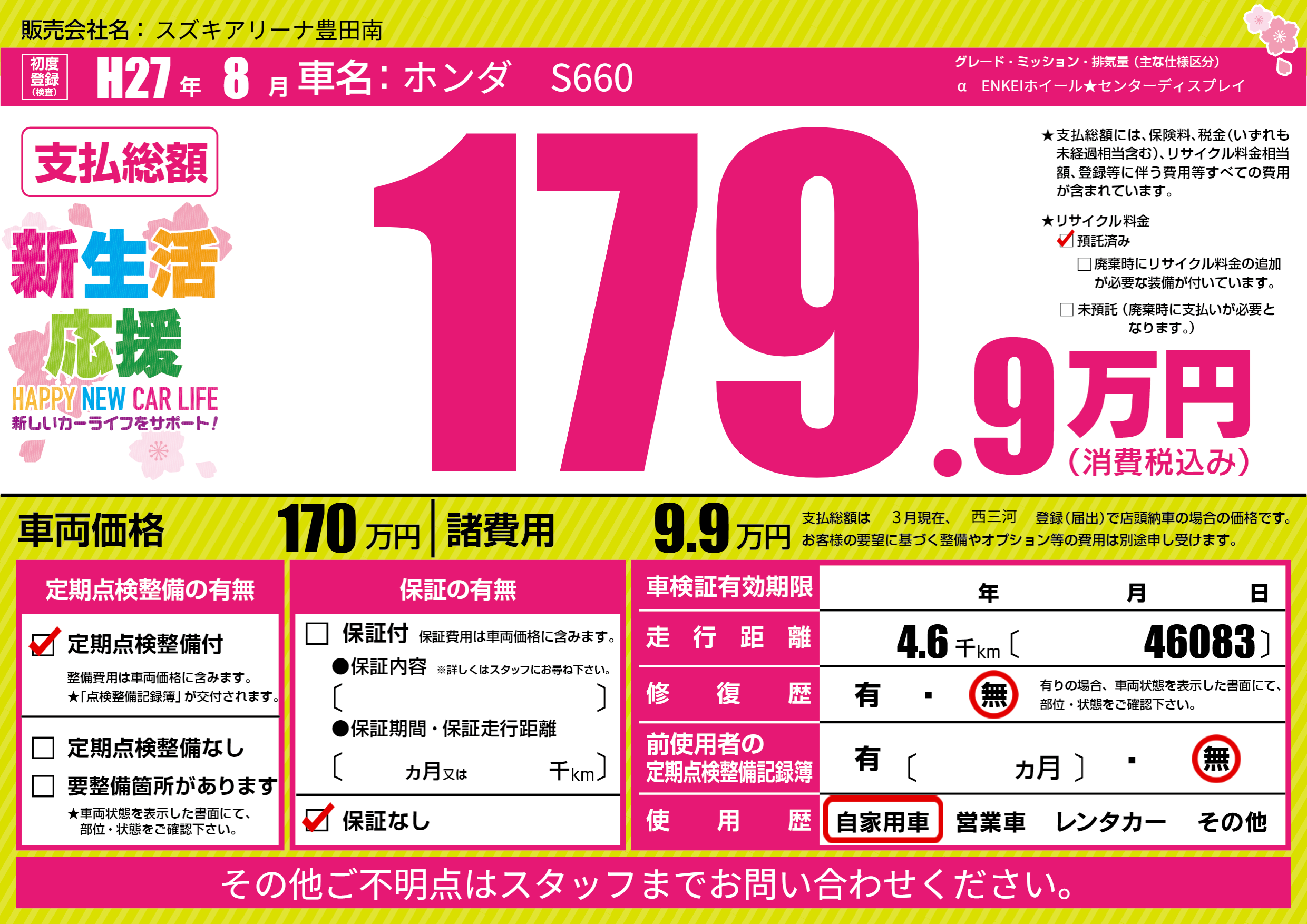 | 車名 | ホンダ S660 | グレード ミッション 排気量 |