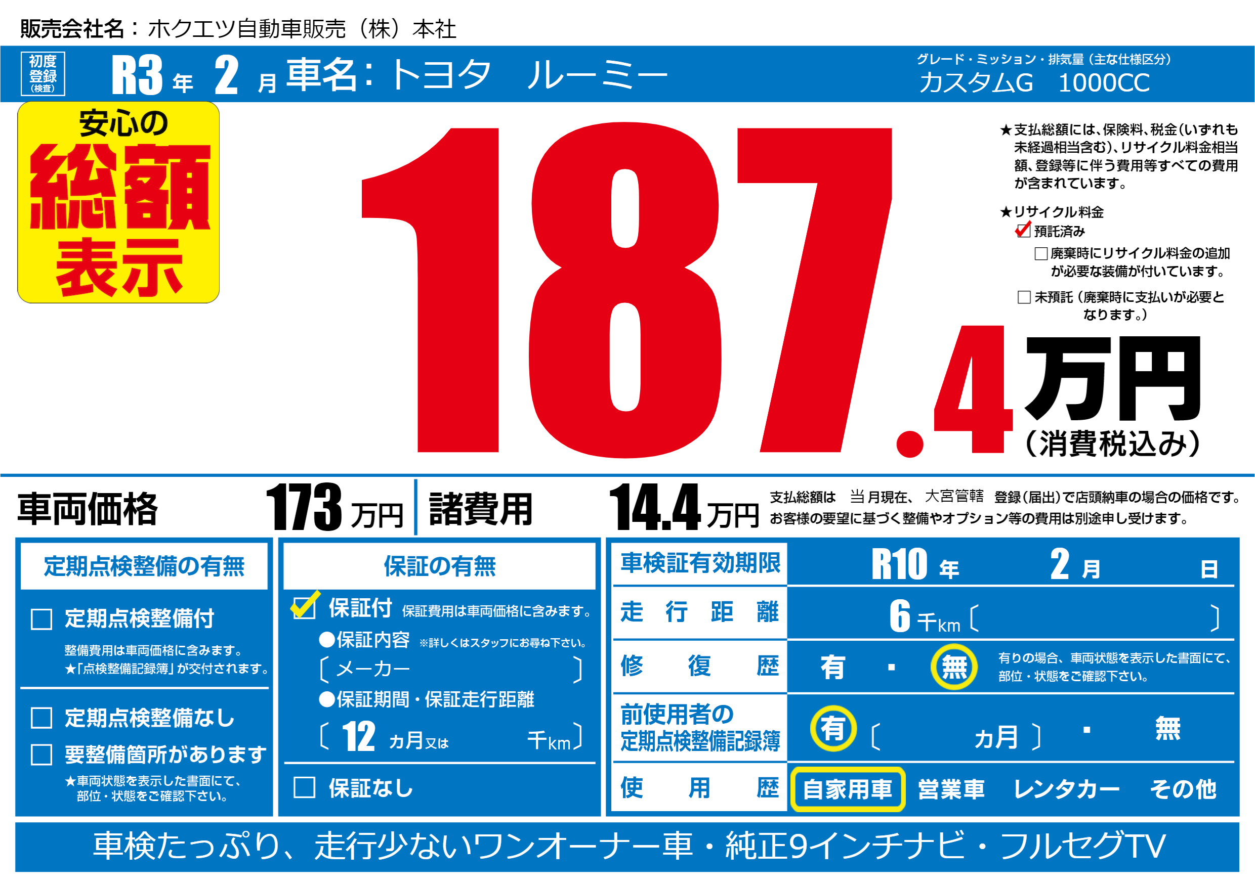 | 車名 | トヨタ ルーミー | グレード ミッション 排気量 |