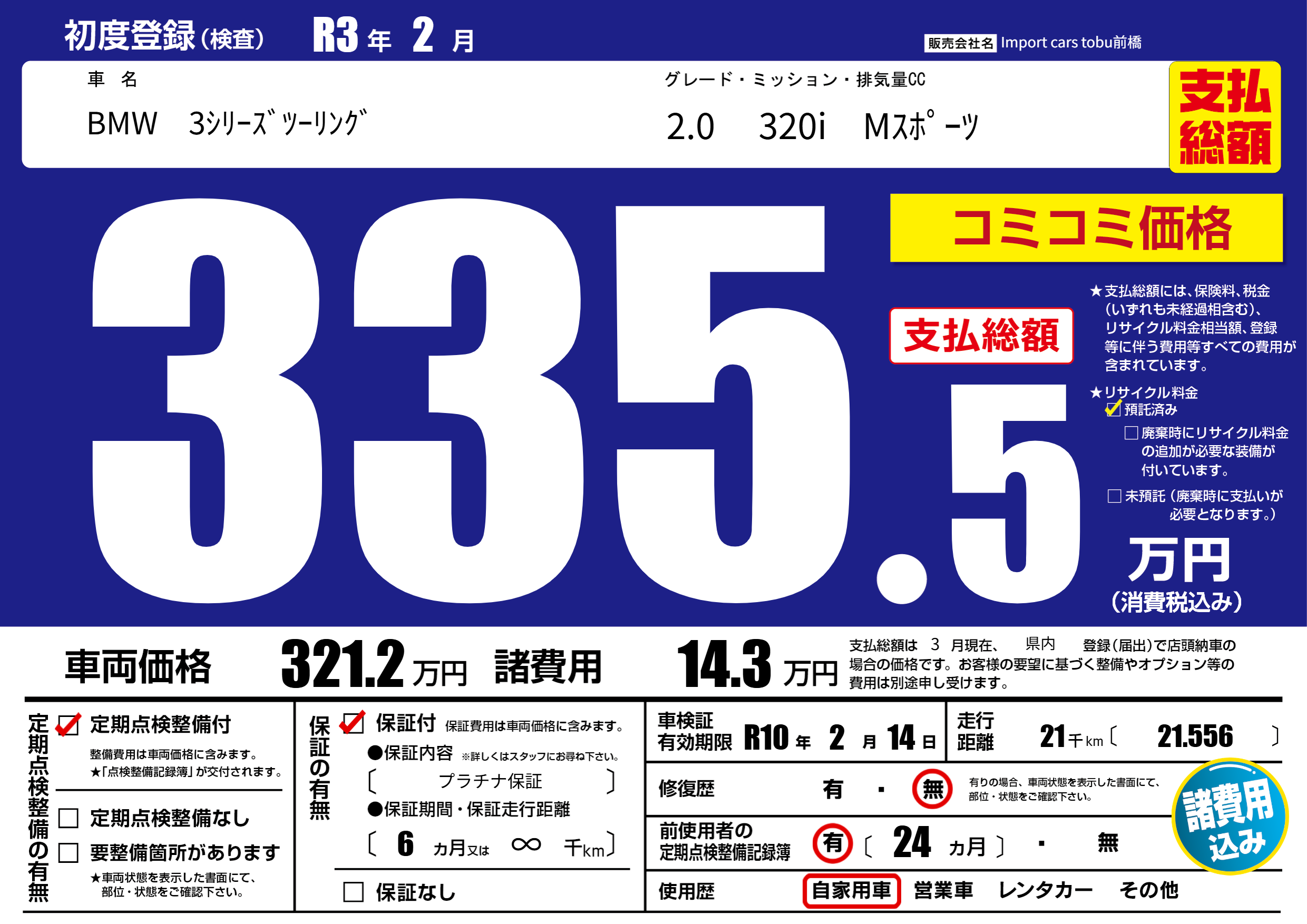 | 車名 | BMW 3シリーズツーリング | グレード ミッション 排気量 |