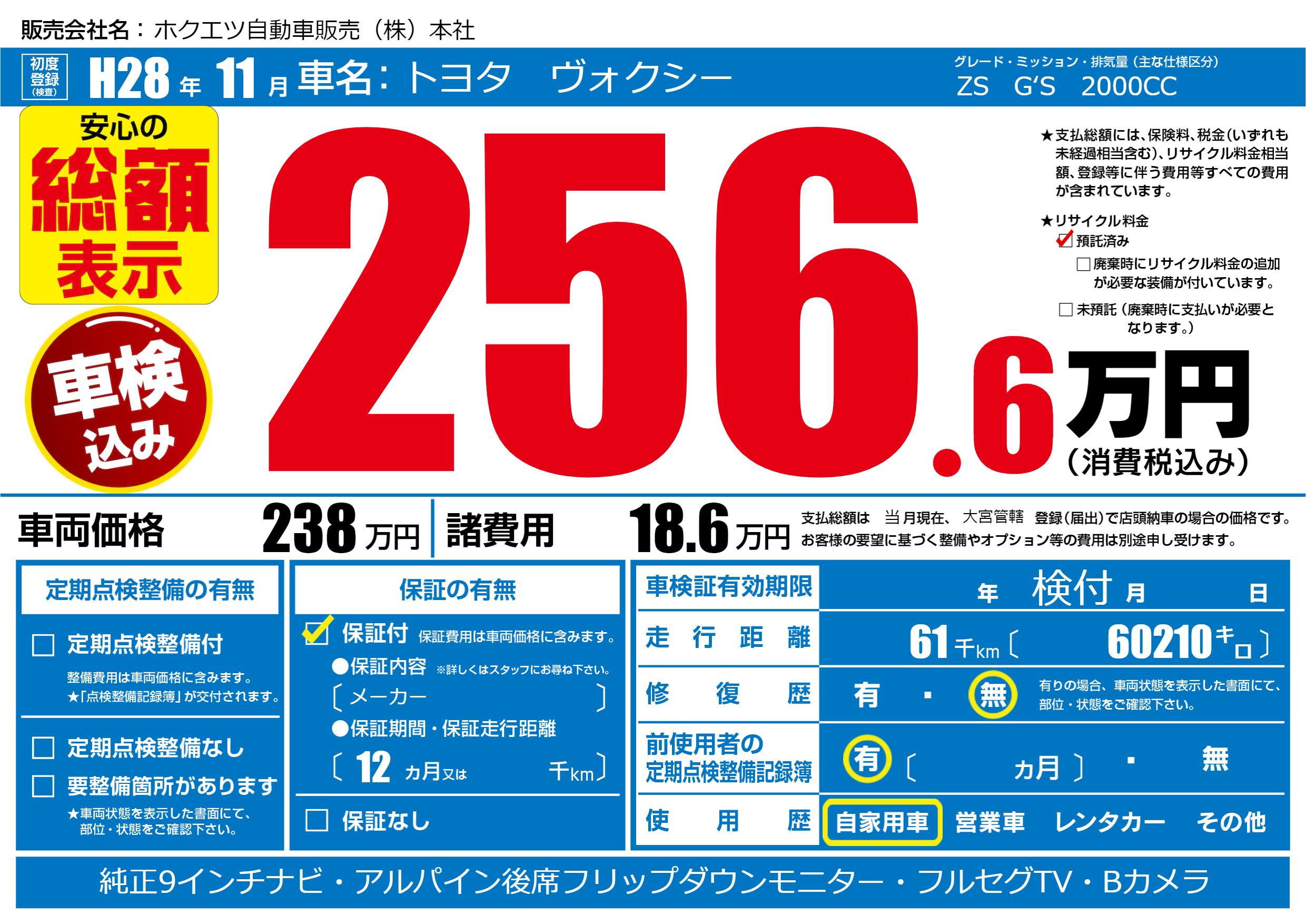 | 走行キロ | 6.1万km | 初年度登録 | H28年11月 |