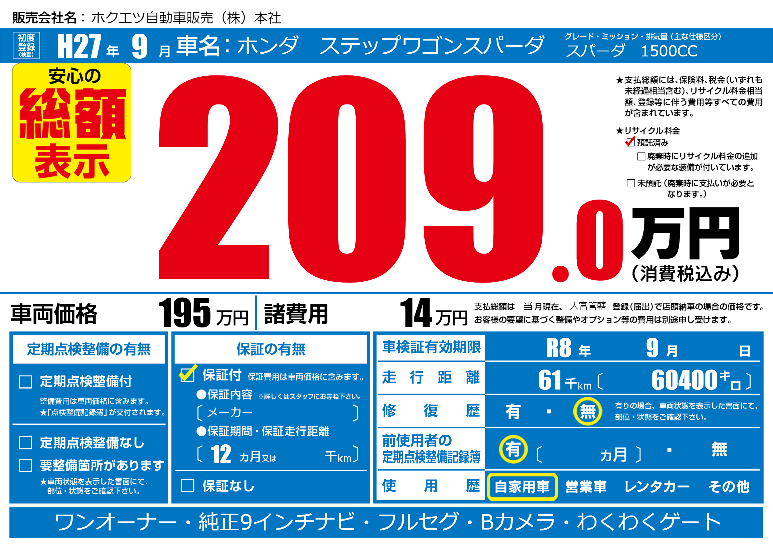 | 車名 | ホンダ ステップワゴンスパーダ | グレード ミッション 排気量 |