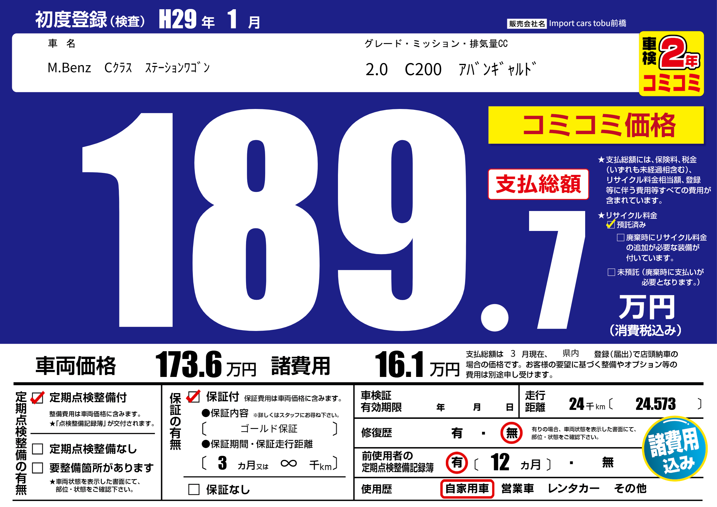 | 車名 | M.Benz Cクラス ステーションワゴン | グレード ミッション 排気量 |