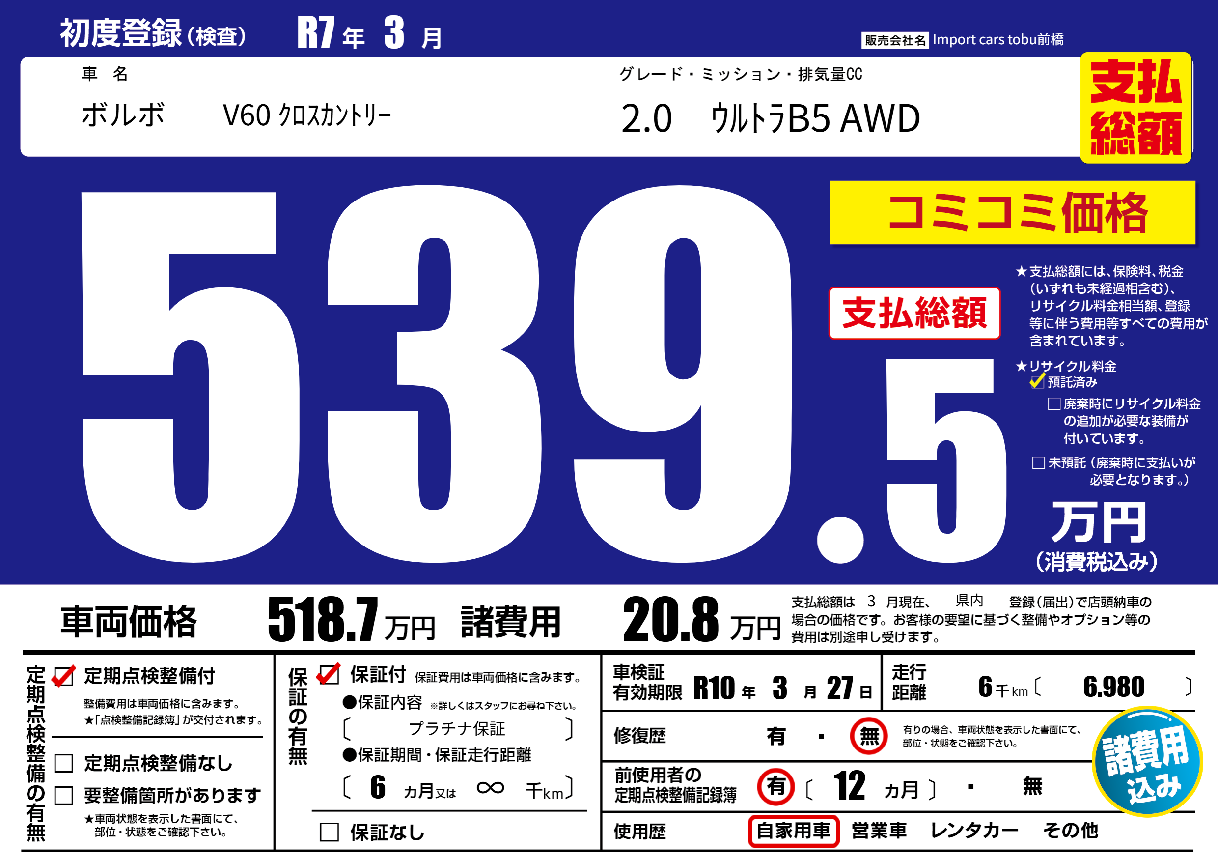 保証付き 保証内容( プラチナ保証) 6ヶ月または(∞)千kmまで |
