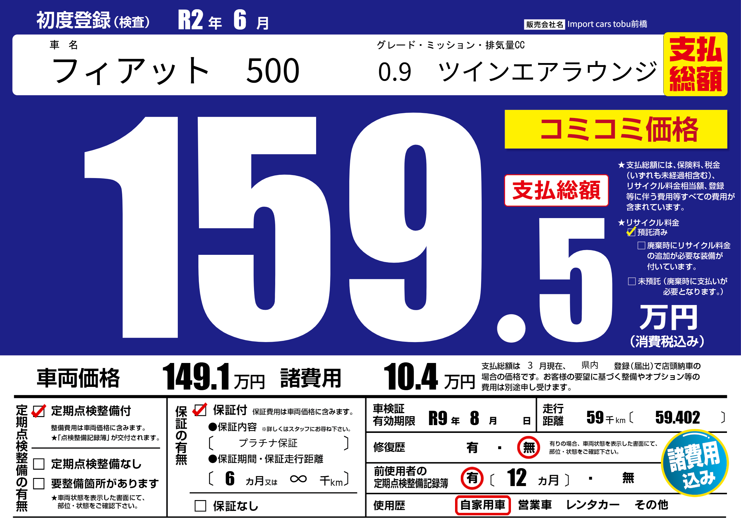| 車名 | フィアット 500 | グレード ミッション 排気量 |