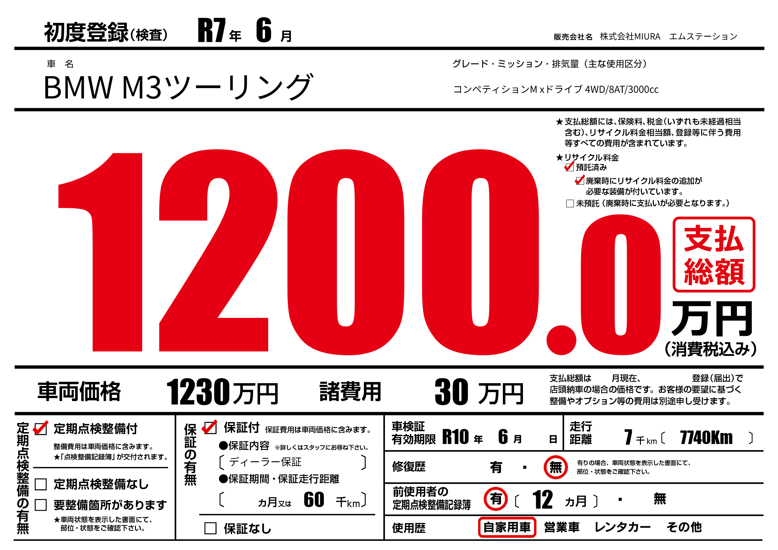 | 車名 | BMW M3ツーリング | グレード ミッション 排気量 |