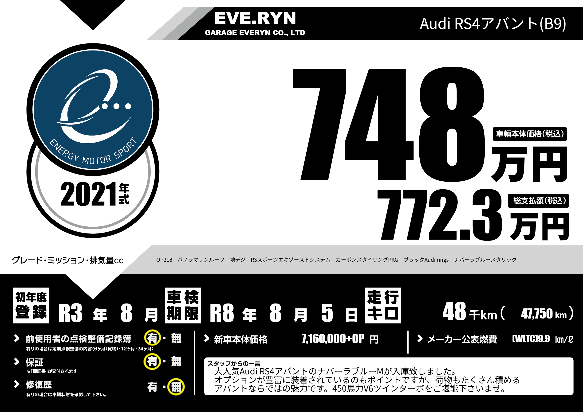 | 車名 | Audi RS4アバント(B9) | グレード ミッション 排気量 |
