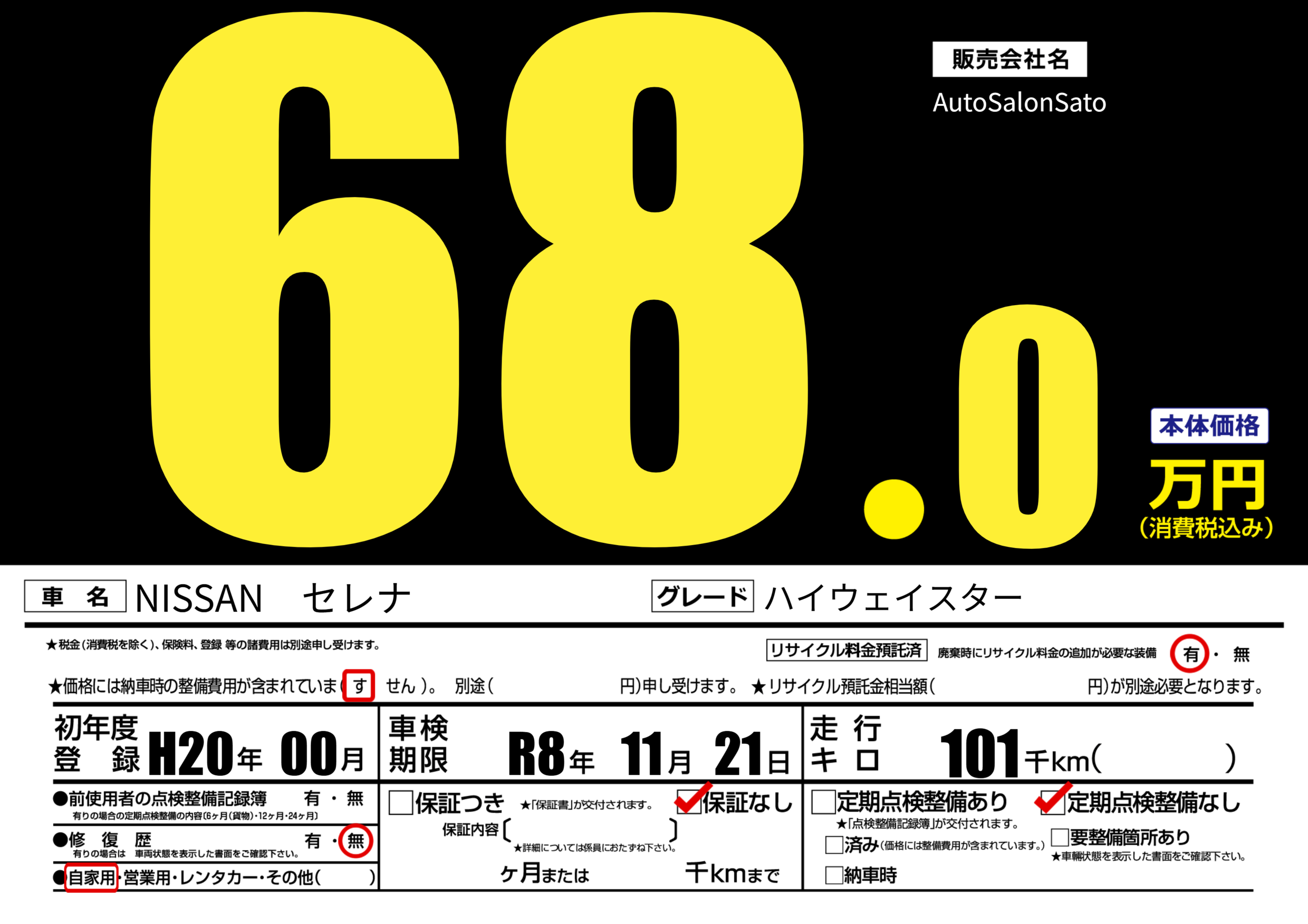 | 走行キロ | 10.1万km | 初年度登録 | H20年00月 |