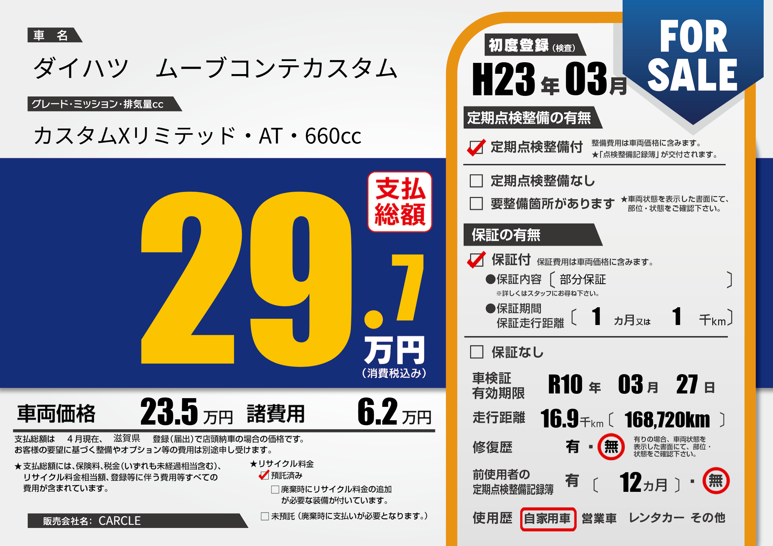 | 車名 | ダイハツ ムーブコンテカスタム | グレード ミッション 排気量 |