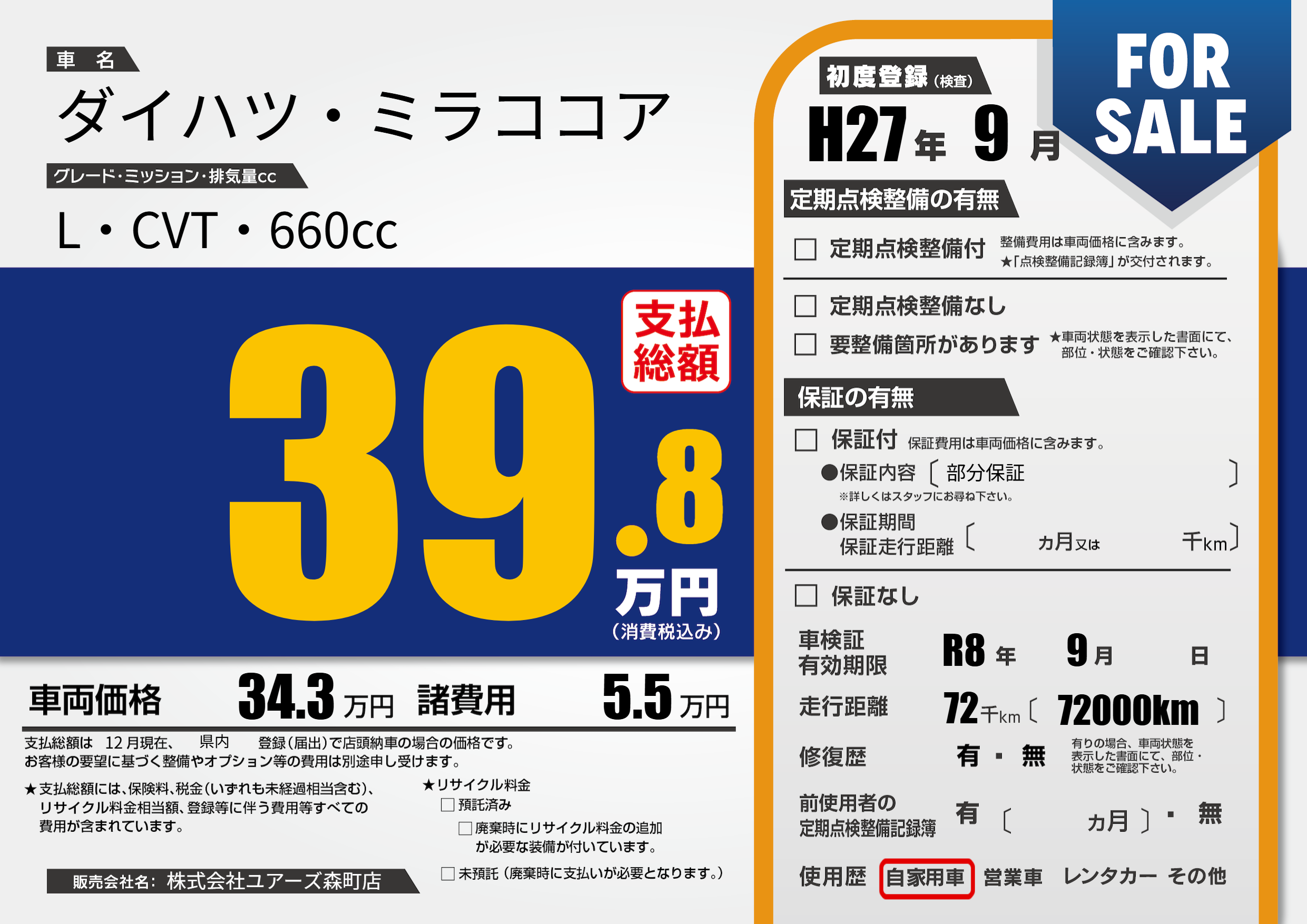 なし | 車検制限 | R8年9月---月 |