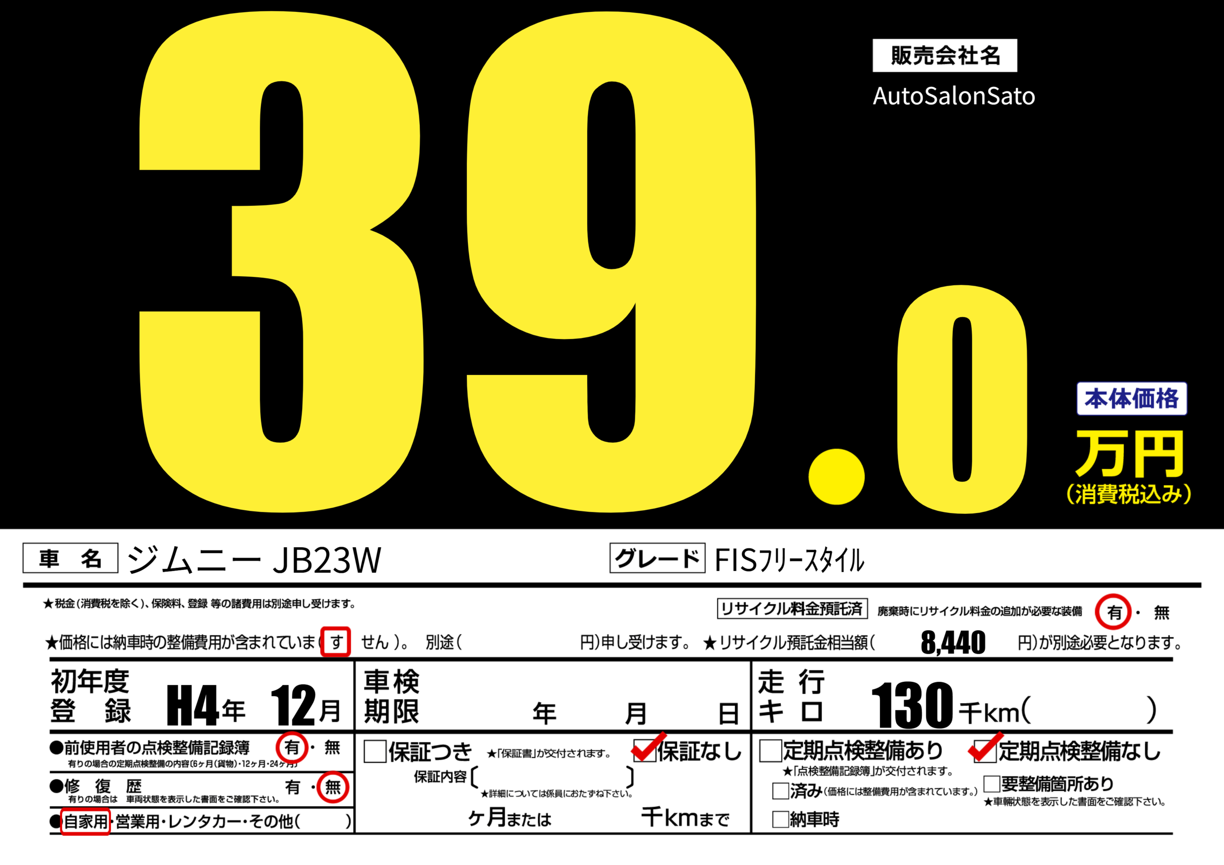 | 走行キロ | 13万km | 初年度登録 | H4年12月 |