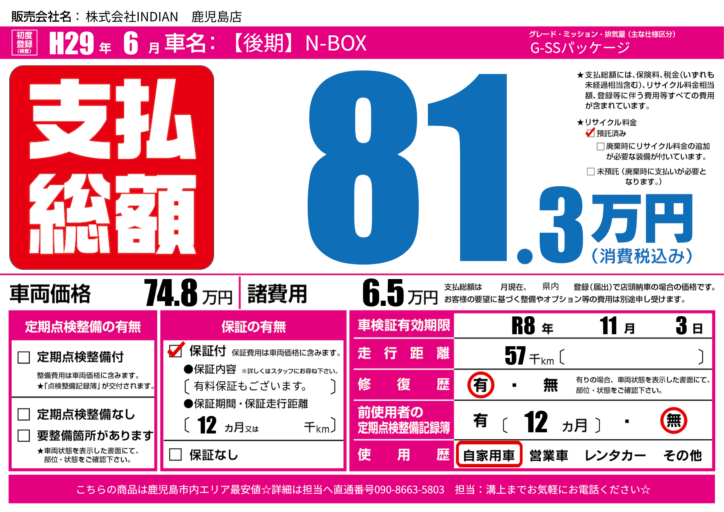 | 走行キロ | 5.7万km | 初年度登録 | H29年6月 |