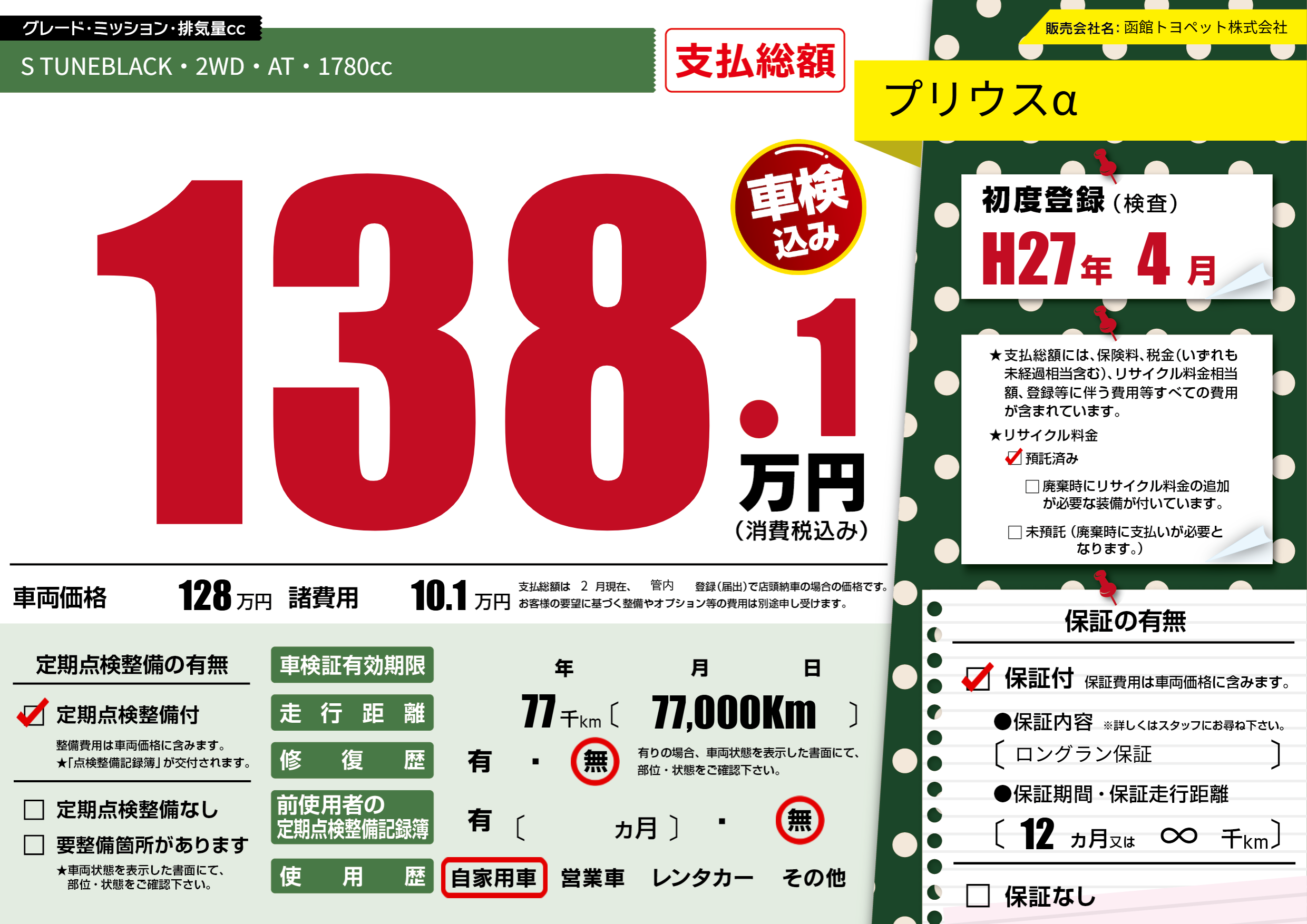 | 車名 | プリウスα | グレード ミッション 排気量 |