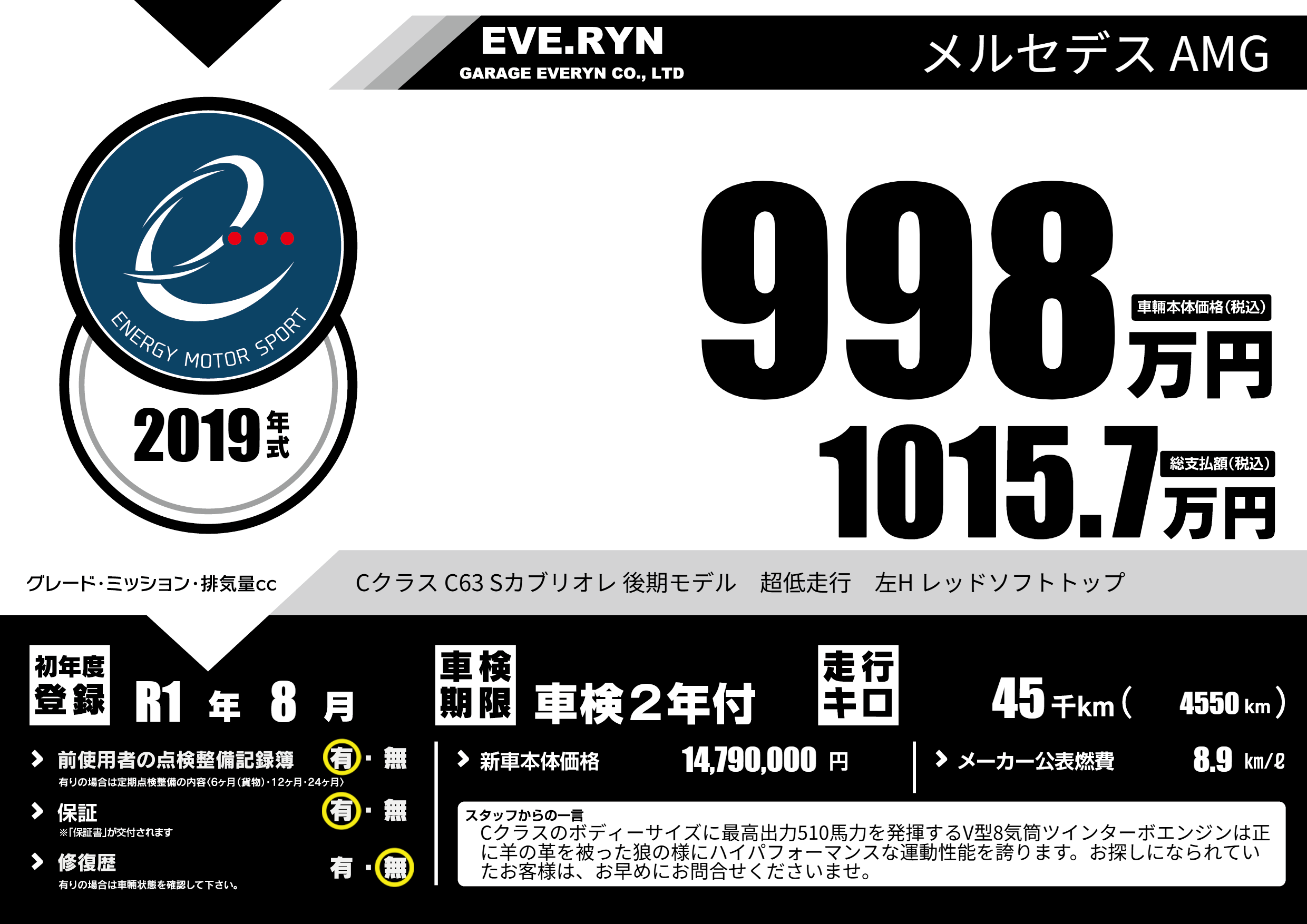 | 車名 | メルセデス AMG | グレード ミッション 排気量 |