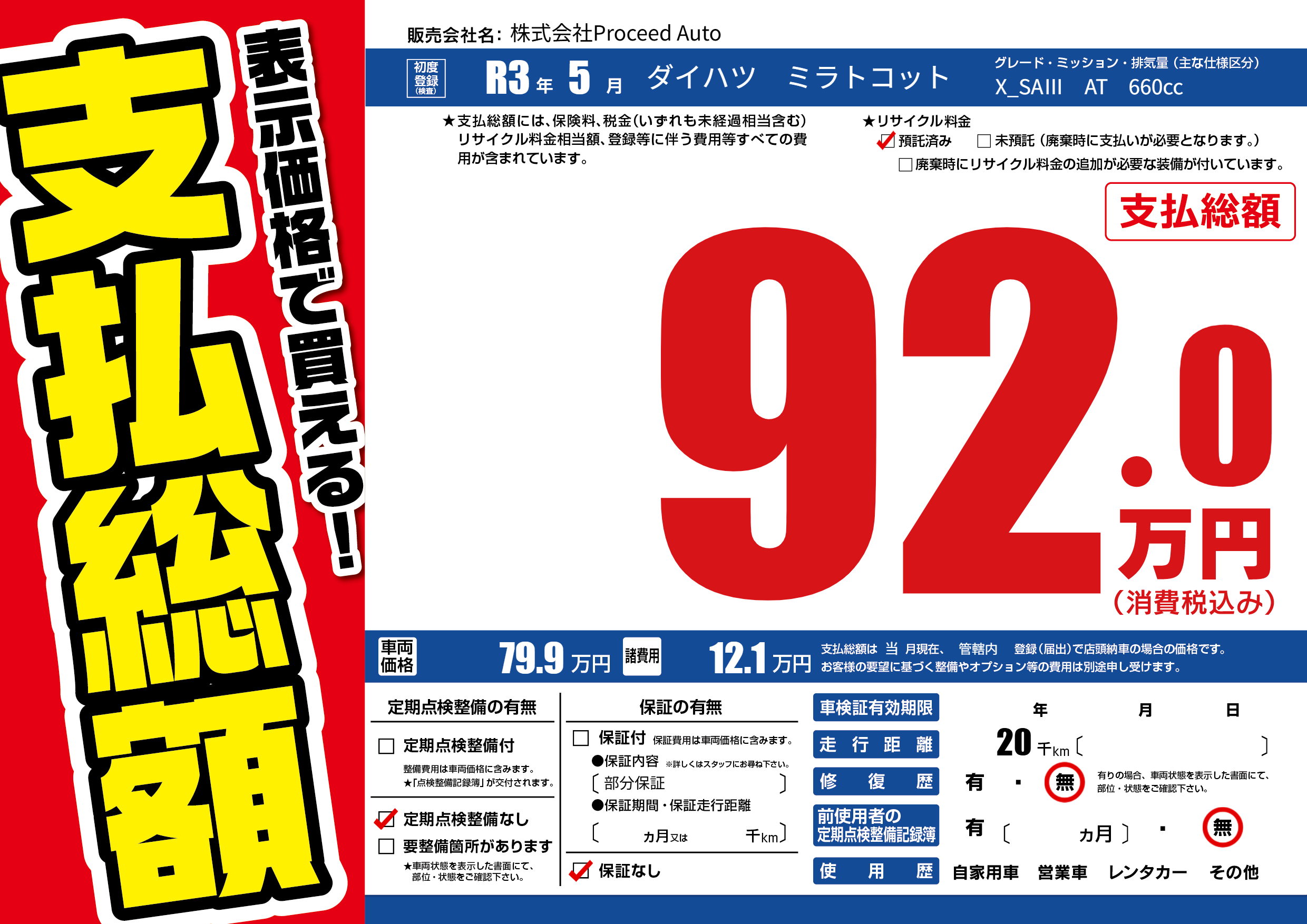 | 車検制限 | - 年 - 月 - 日 | ||