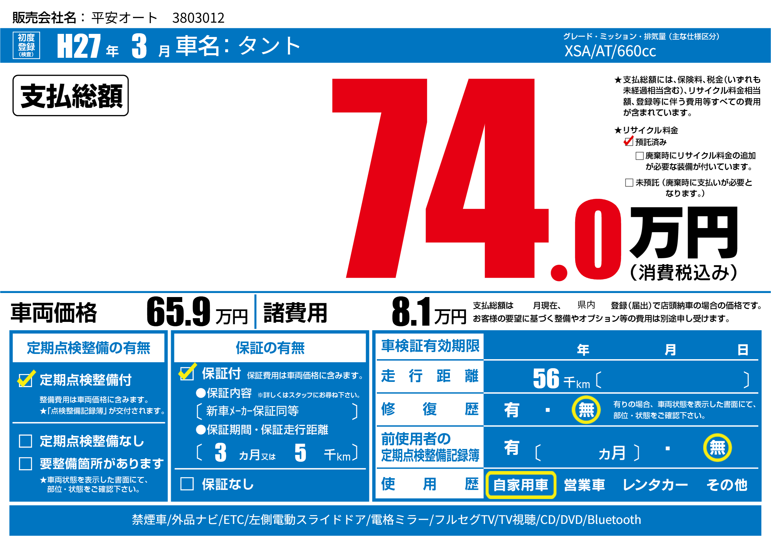 | 走行キロ | 5.6万km | 初年度登録 | H27年3月 |