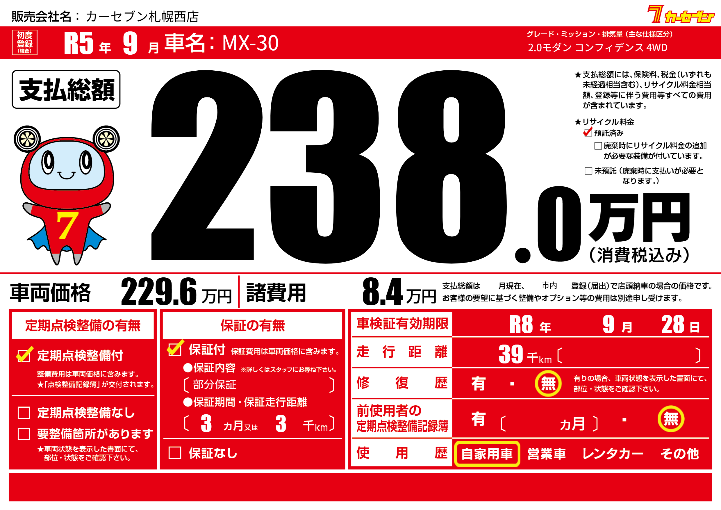 | 走行キロ | 3.9万km | 初年度登録 | R5年9月 |