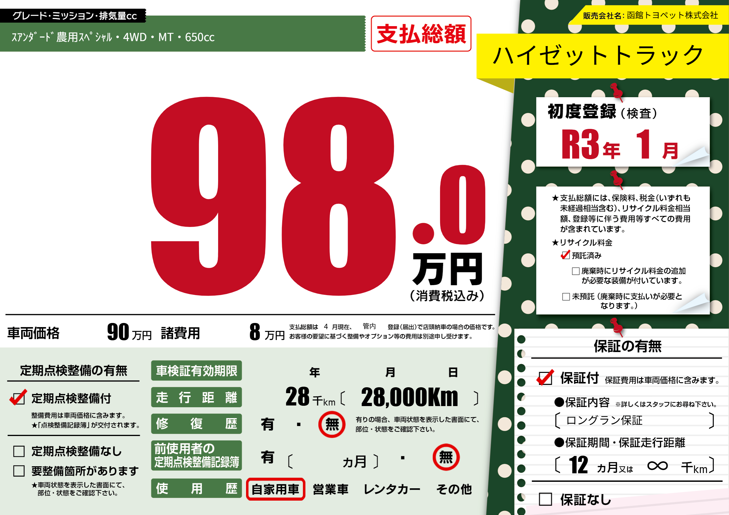 | 車名 | ハイゼットトラック | グレード ミッション 排気量 |