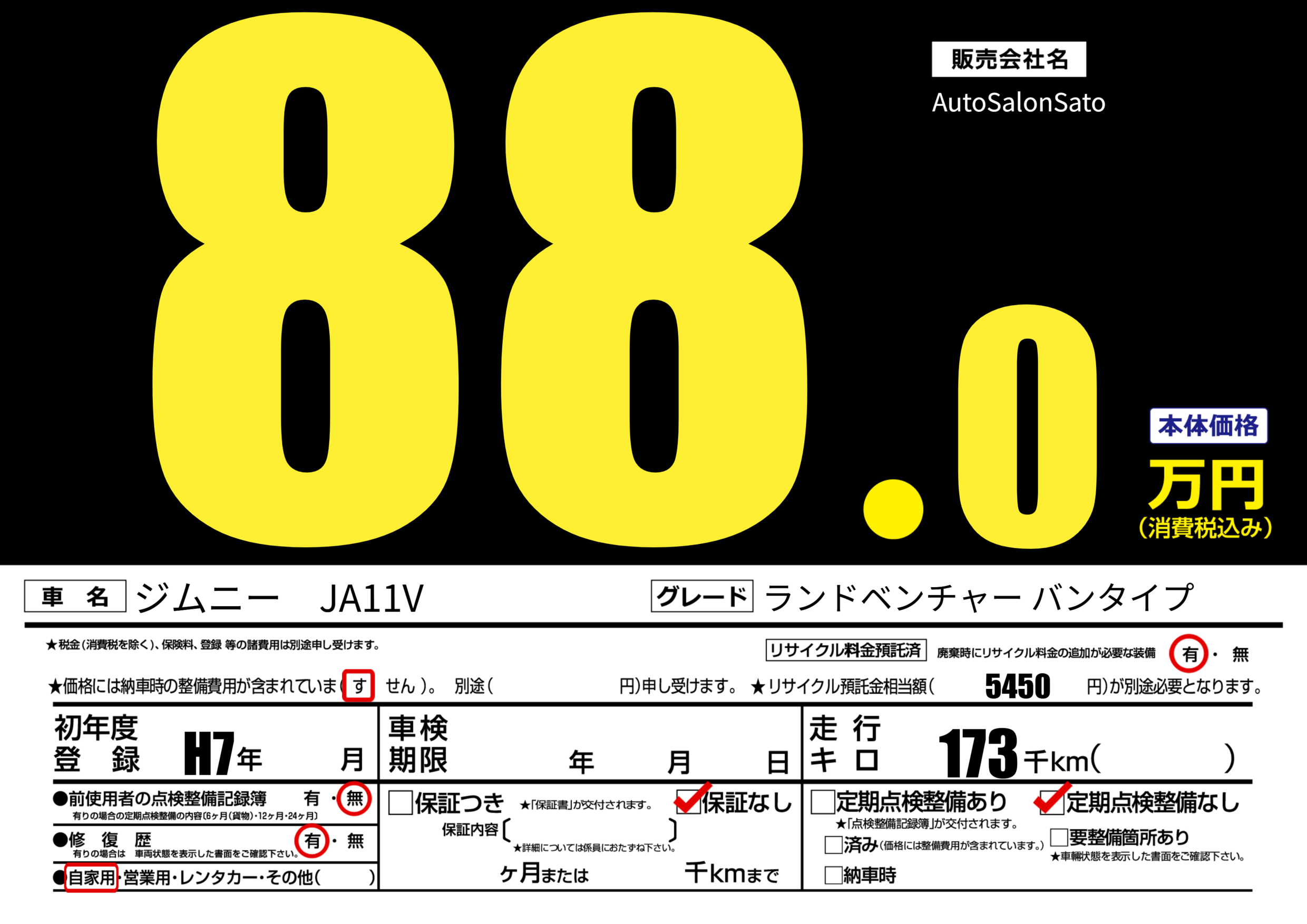 | 走行キロ | 17.3万km | 初年度登録 | H7年---月 |