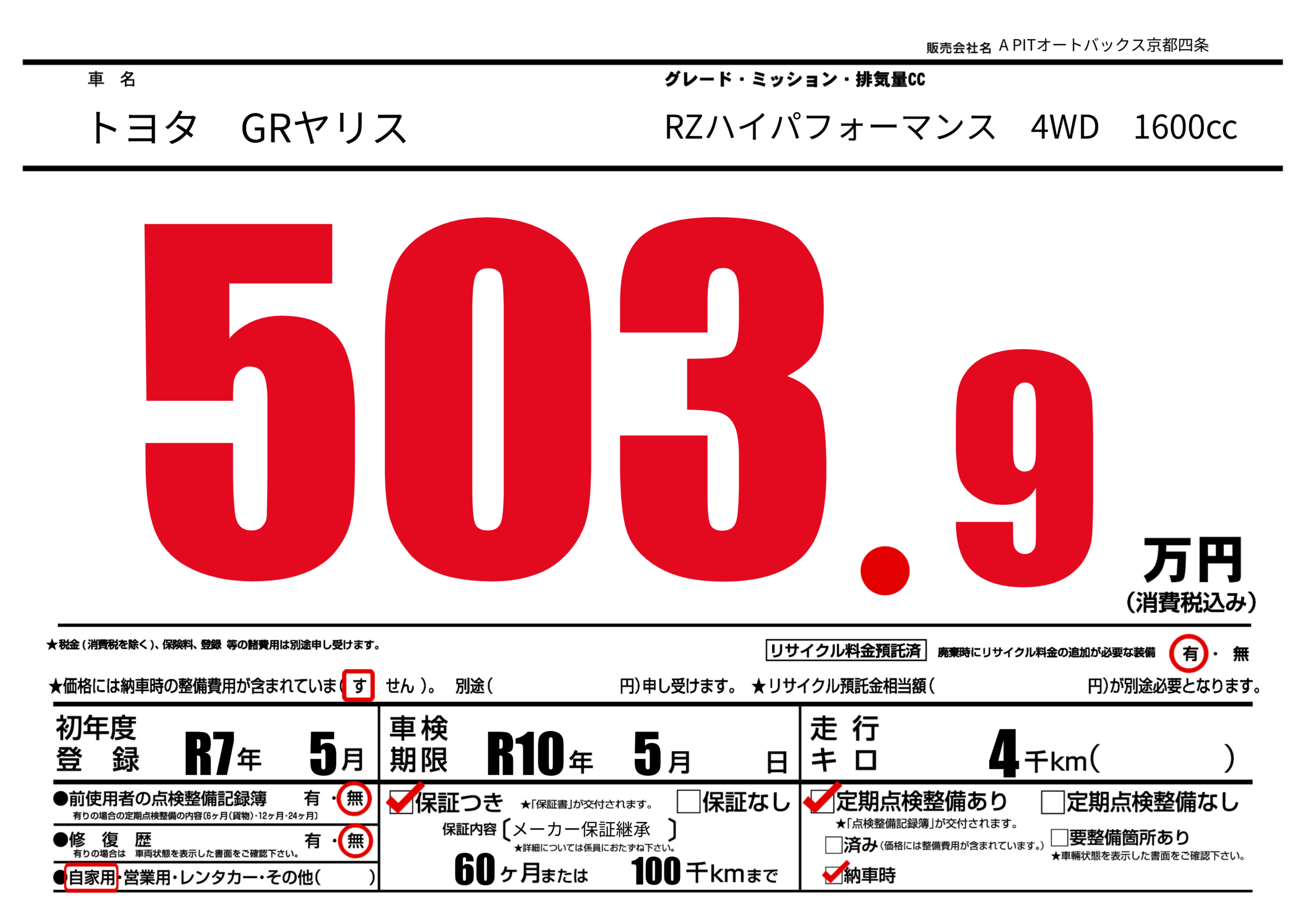 | 車名 | トヨタ GRヤリス | グレード ミッション 排気量 |