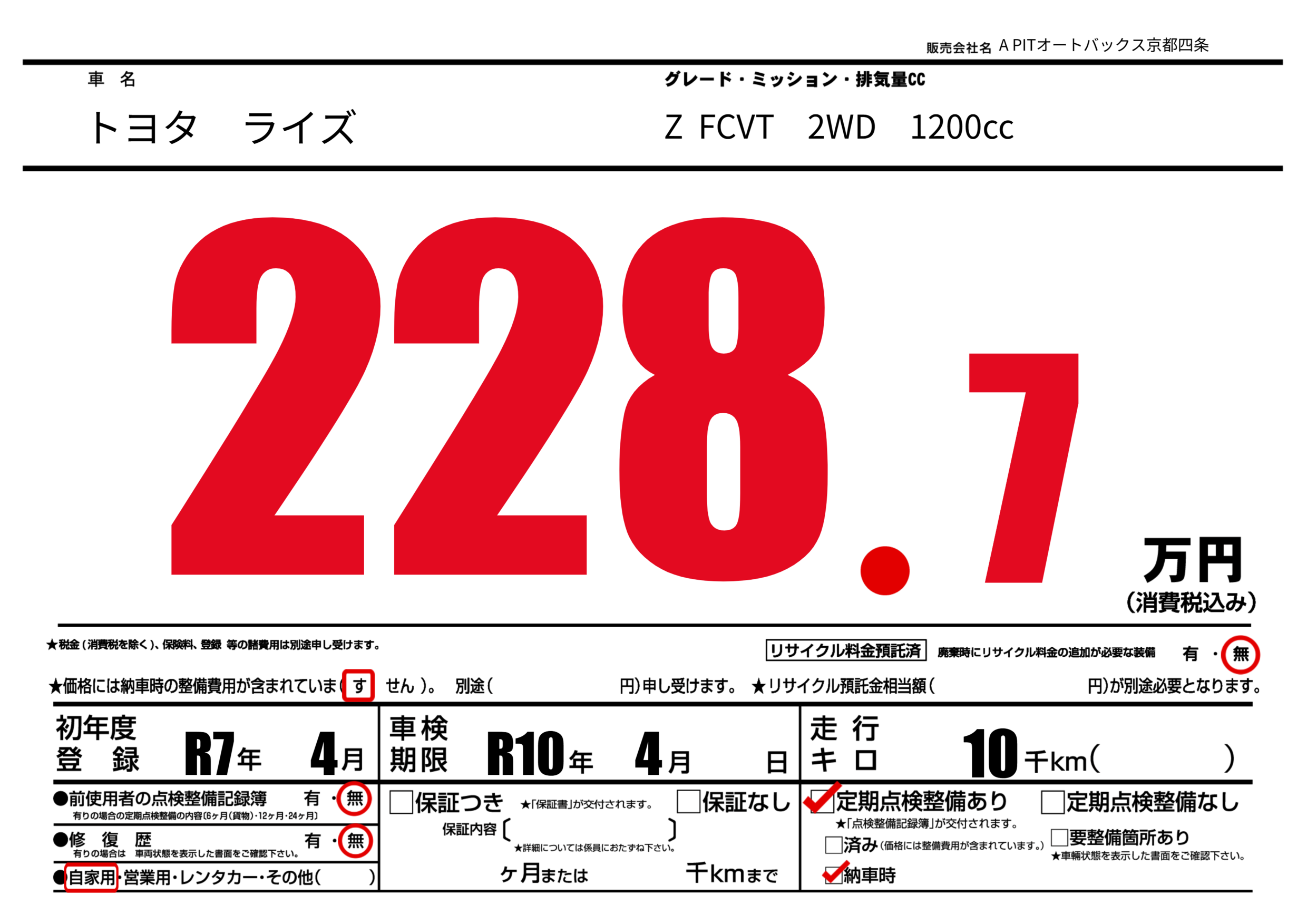 | 車名 | トヨタ ライズ | グレード ミッション 排気量 |