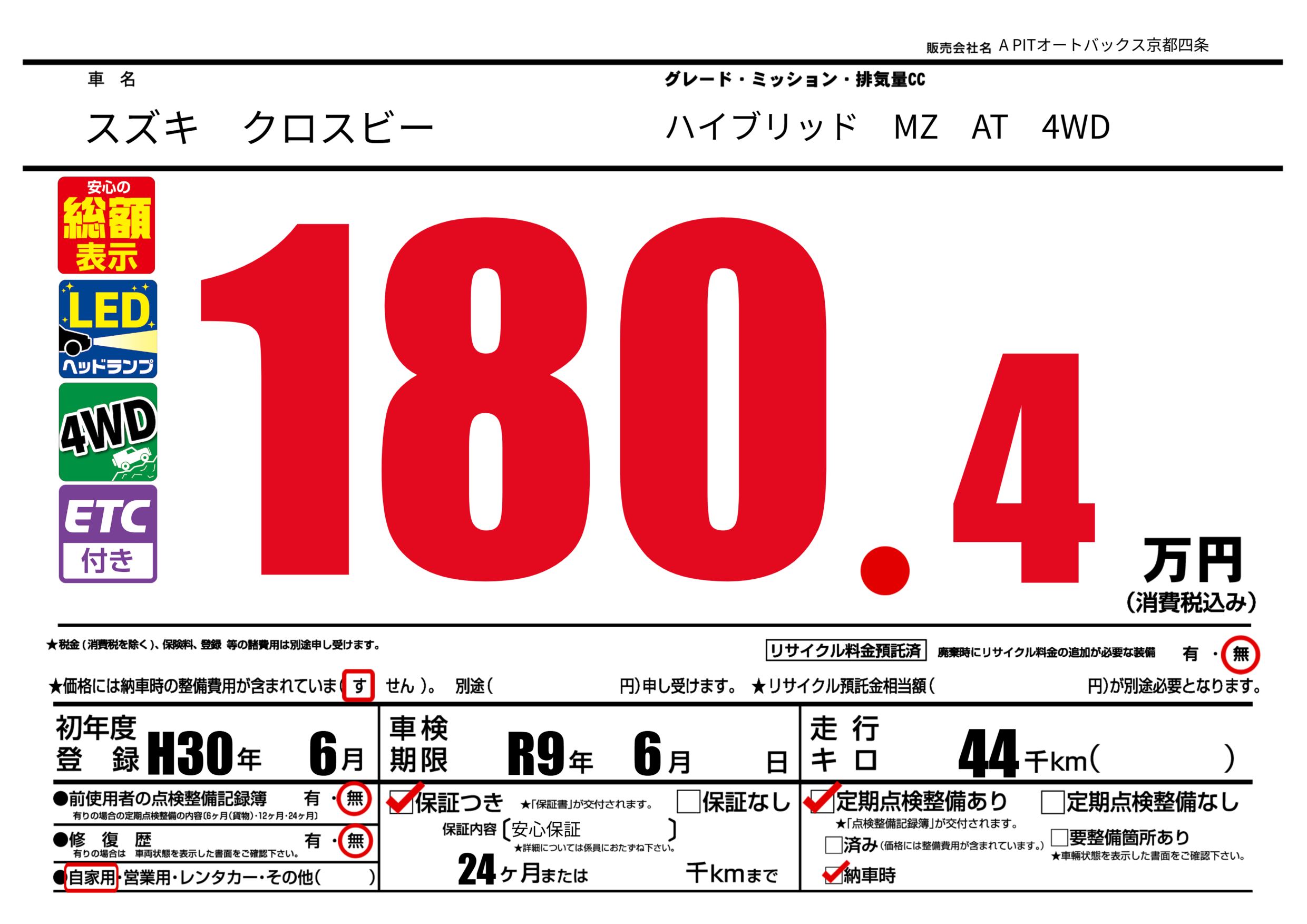 | 車検制限 | R9年 6月 - 日 | ||