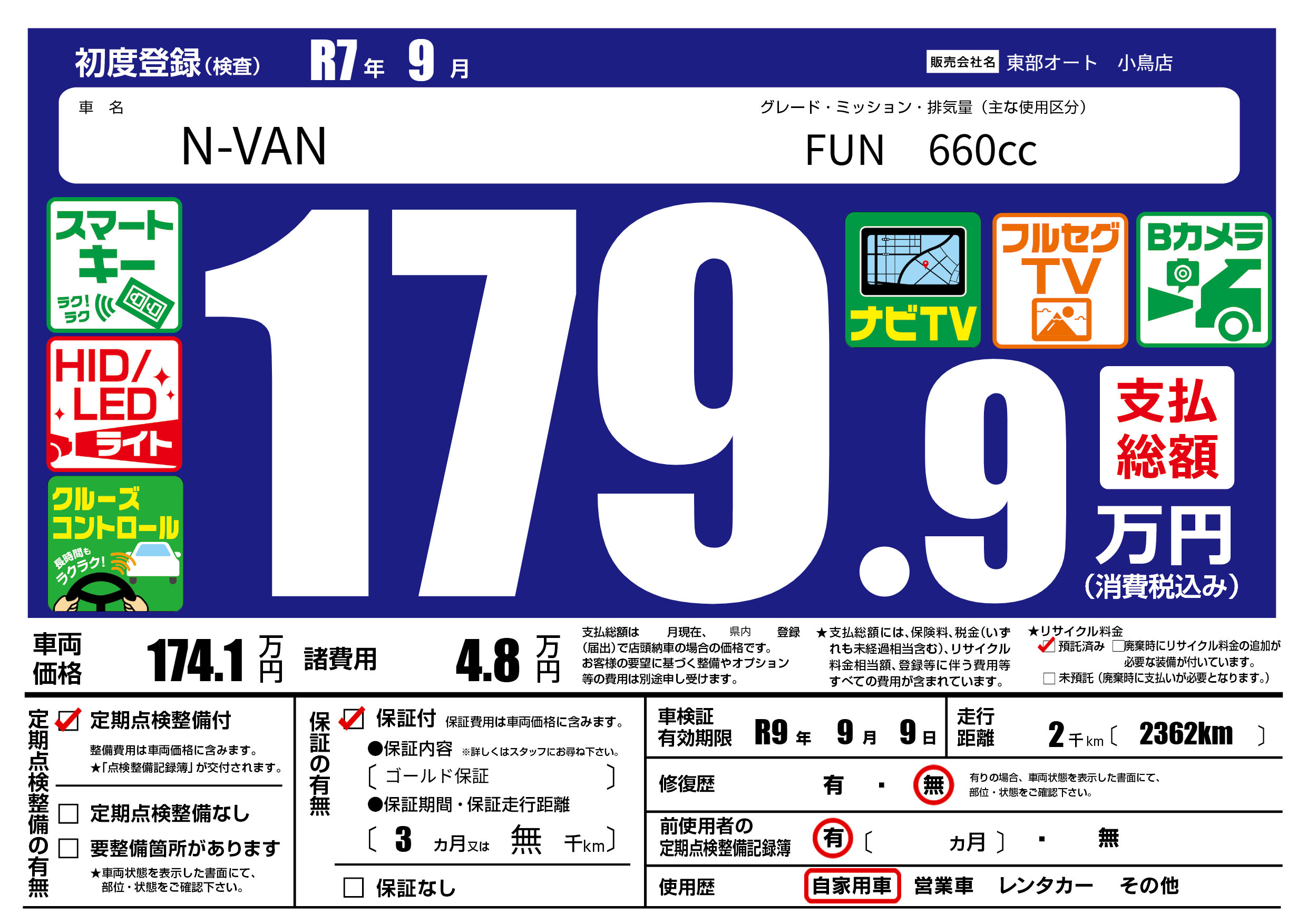 | 車検制限 | R9年 9月 9日 | ||