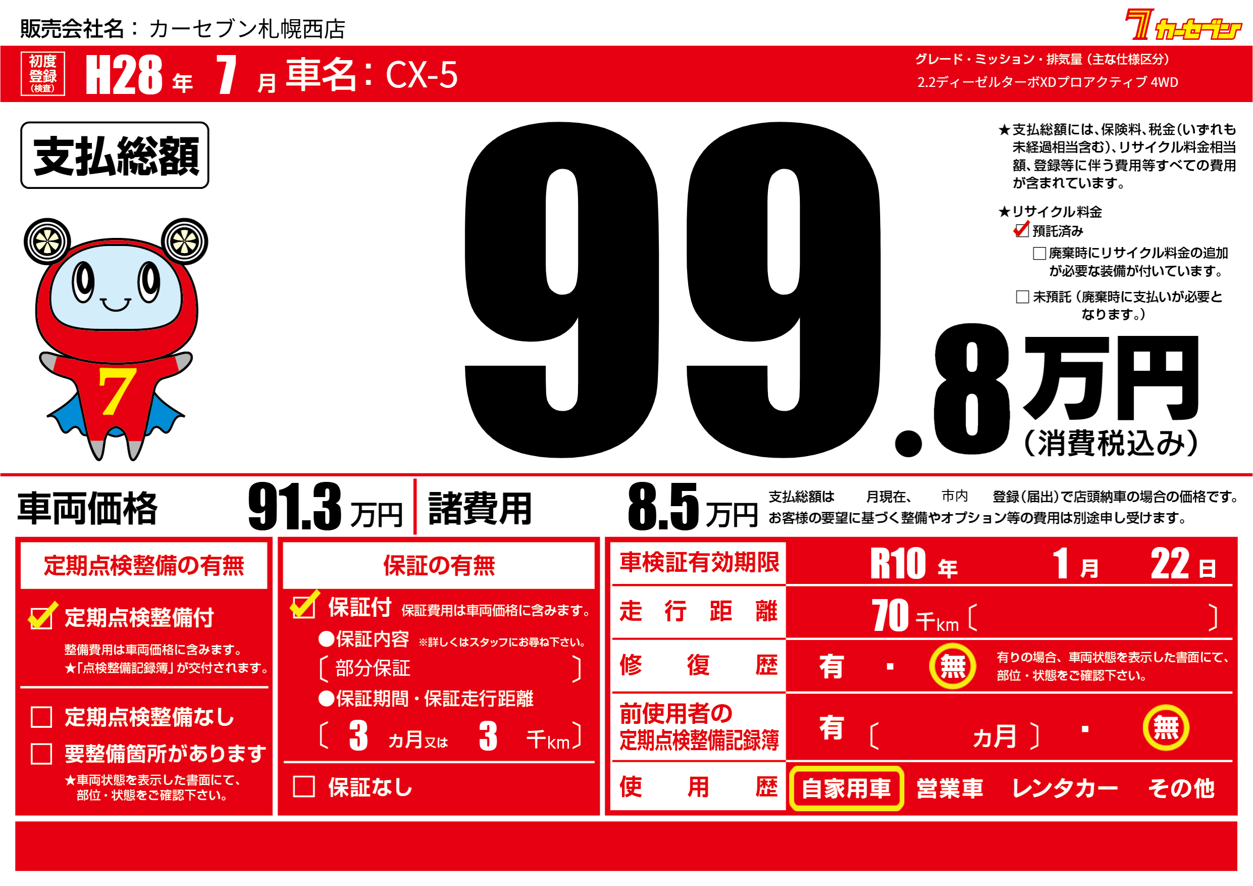 保証付き 保証内容(部分保証) 3ヶ月または(3)千kmまで |