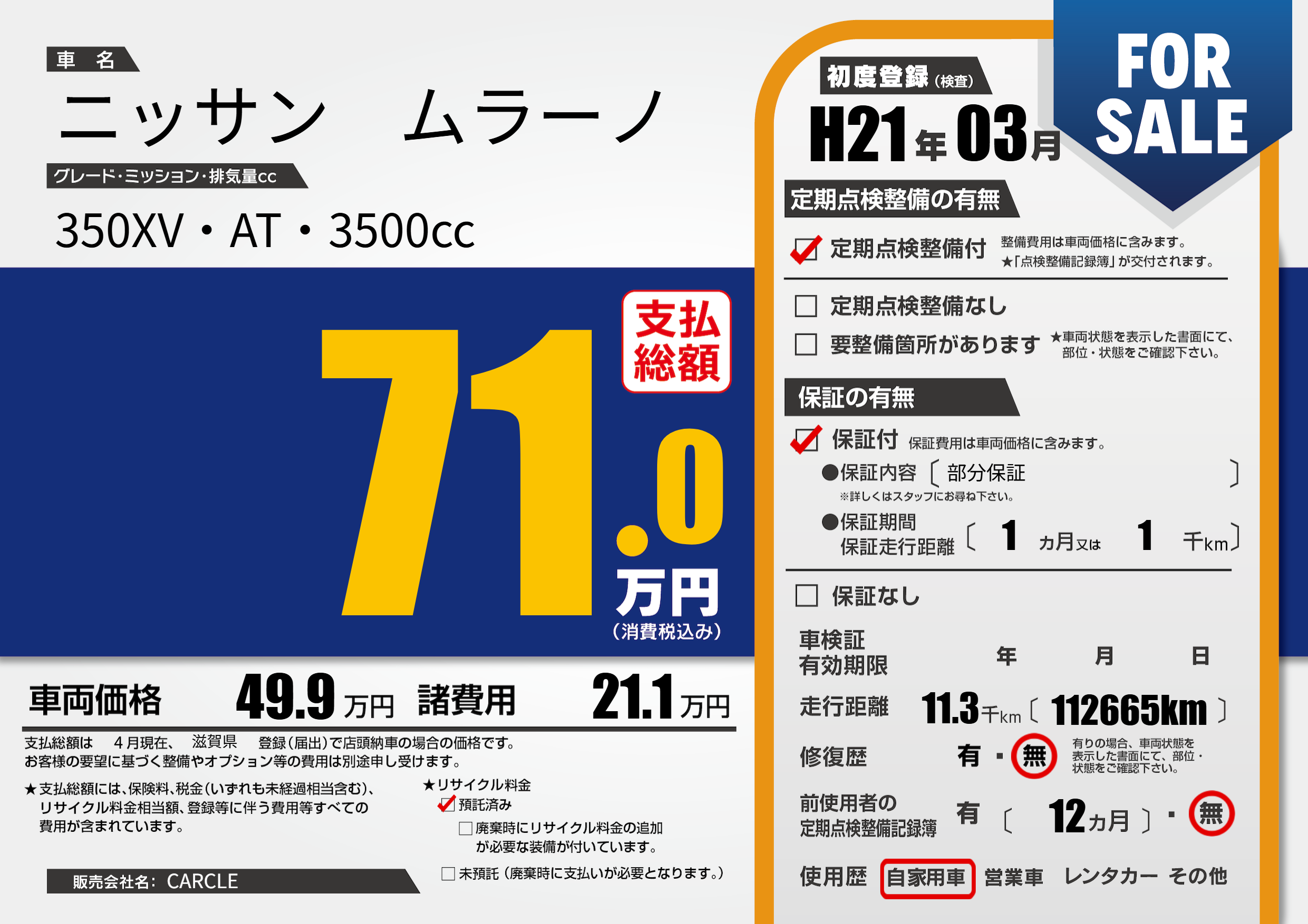 | 車名 | ニッサン ムラーノ | グレード ミッション 排気量 |