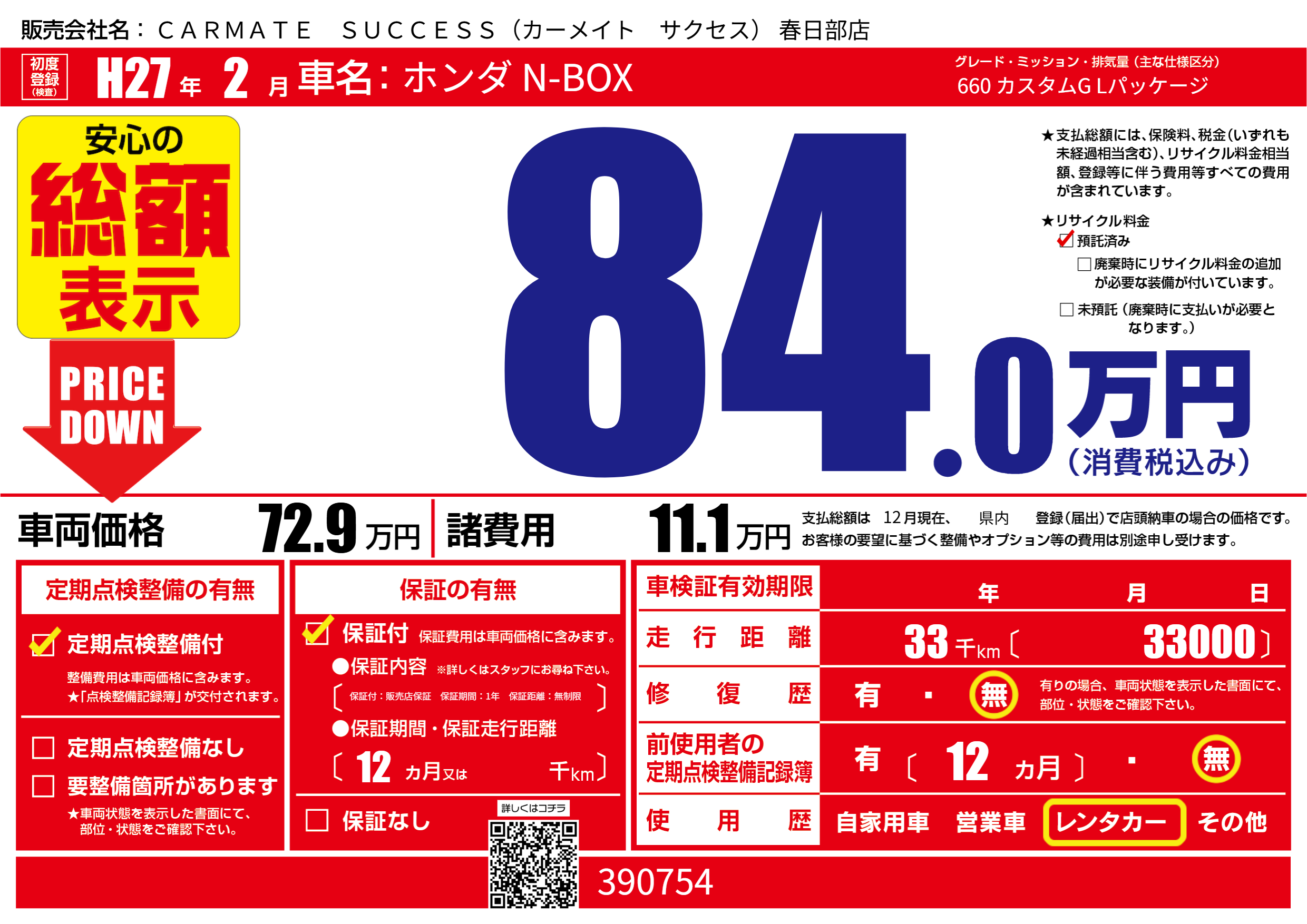 | 走行キロ | 3.3万km | 初年度登録 | H27年2月 |