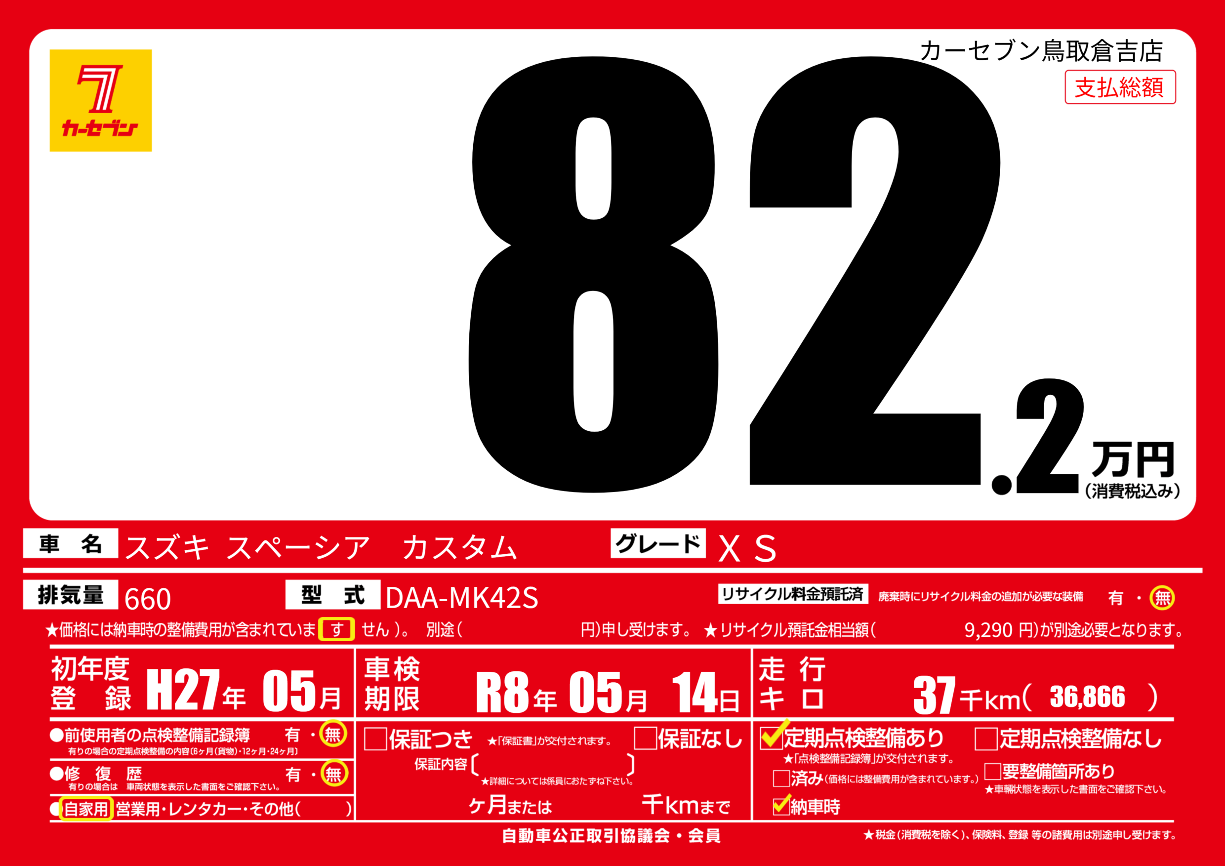 | 車名 | スズキ スペーシア カスタム | グレード ミッション 排気量 |