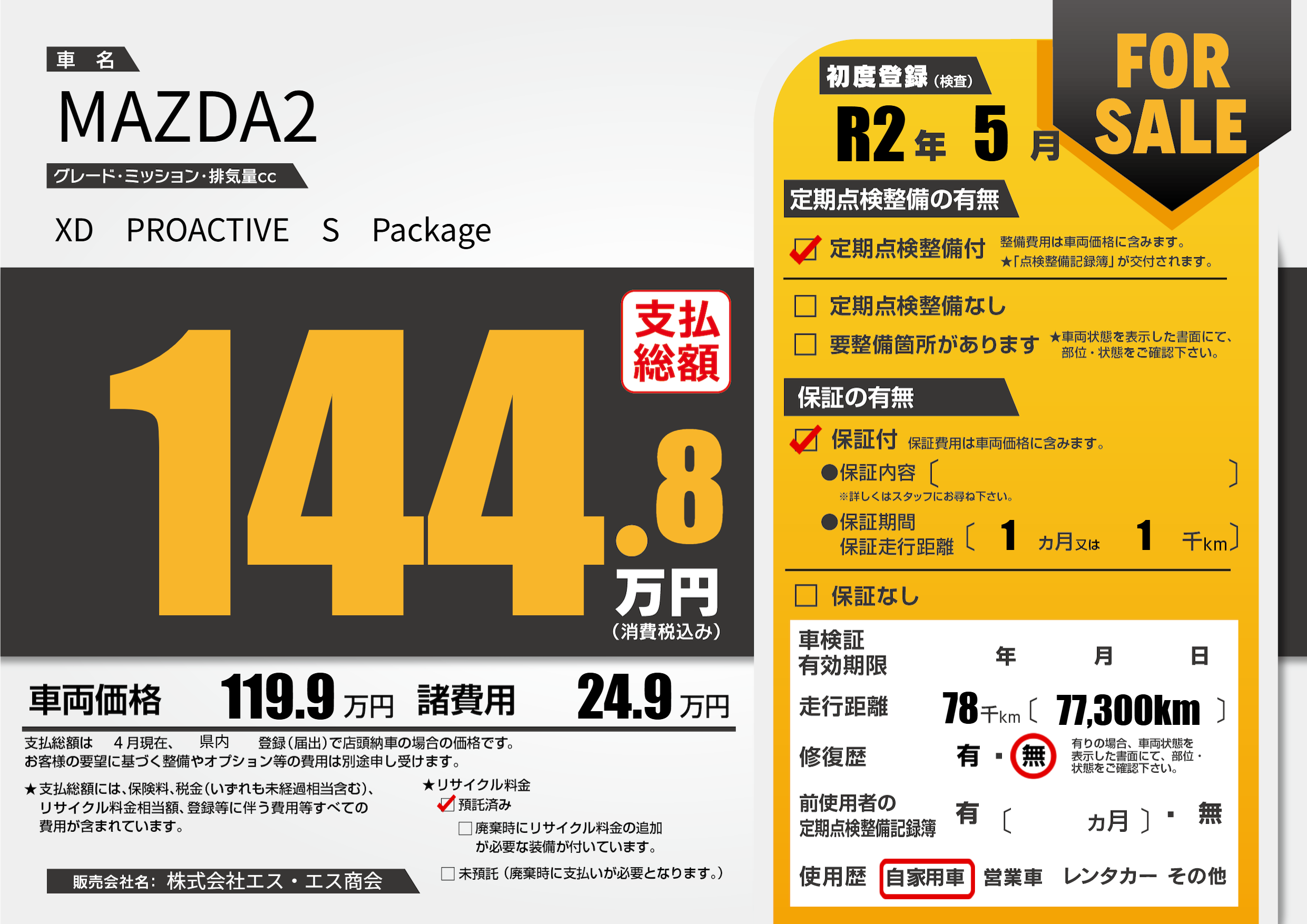 | 走行キロ | 7.8万km | 初年度登録 | R2年5月 |