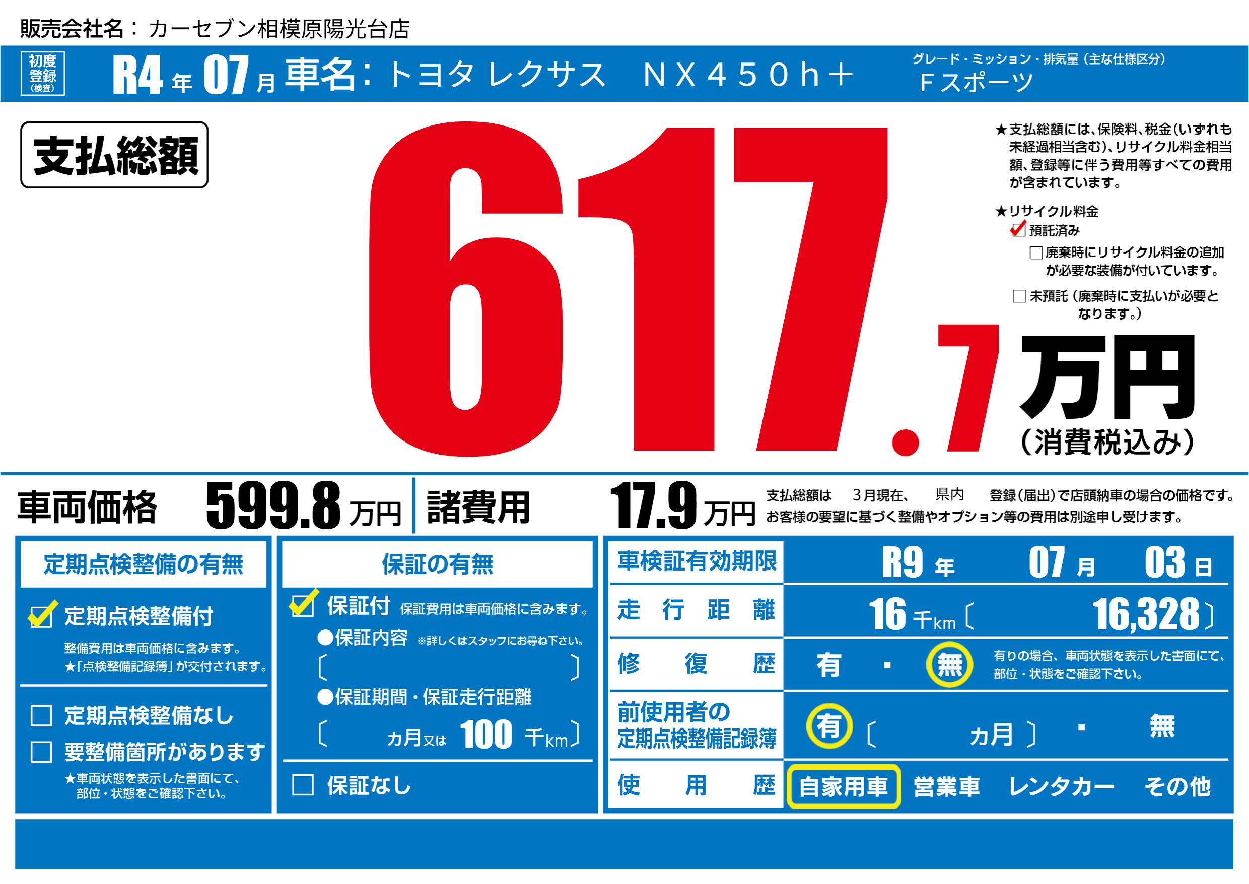 | 車名 | トヨタ レクサス NX450h+ | グレード ミッション 排気量 |
