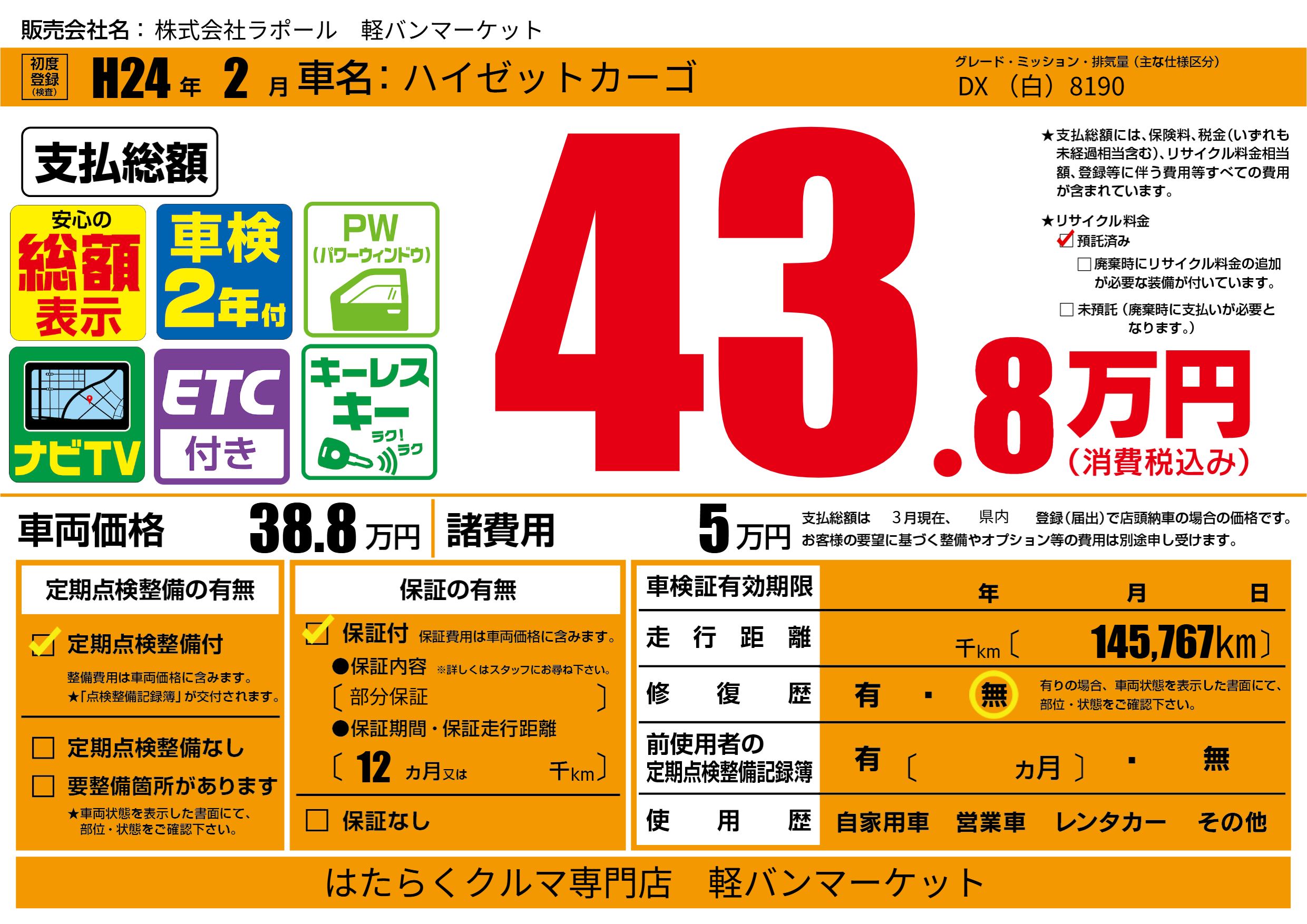 | 車名 | ハイゼットカーゴ | グレード ミッション 排気量 |