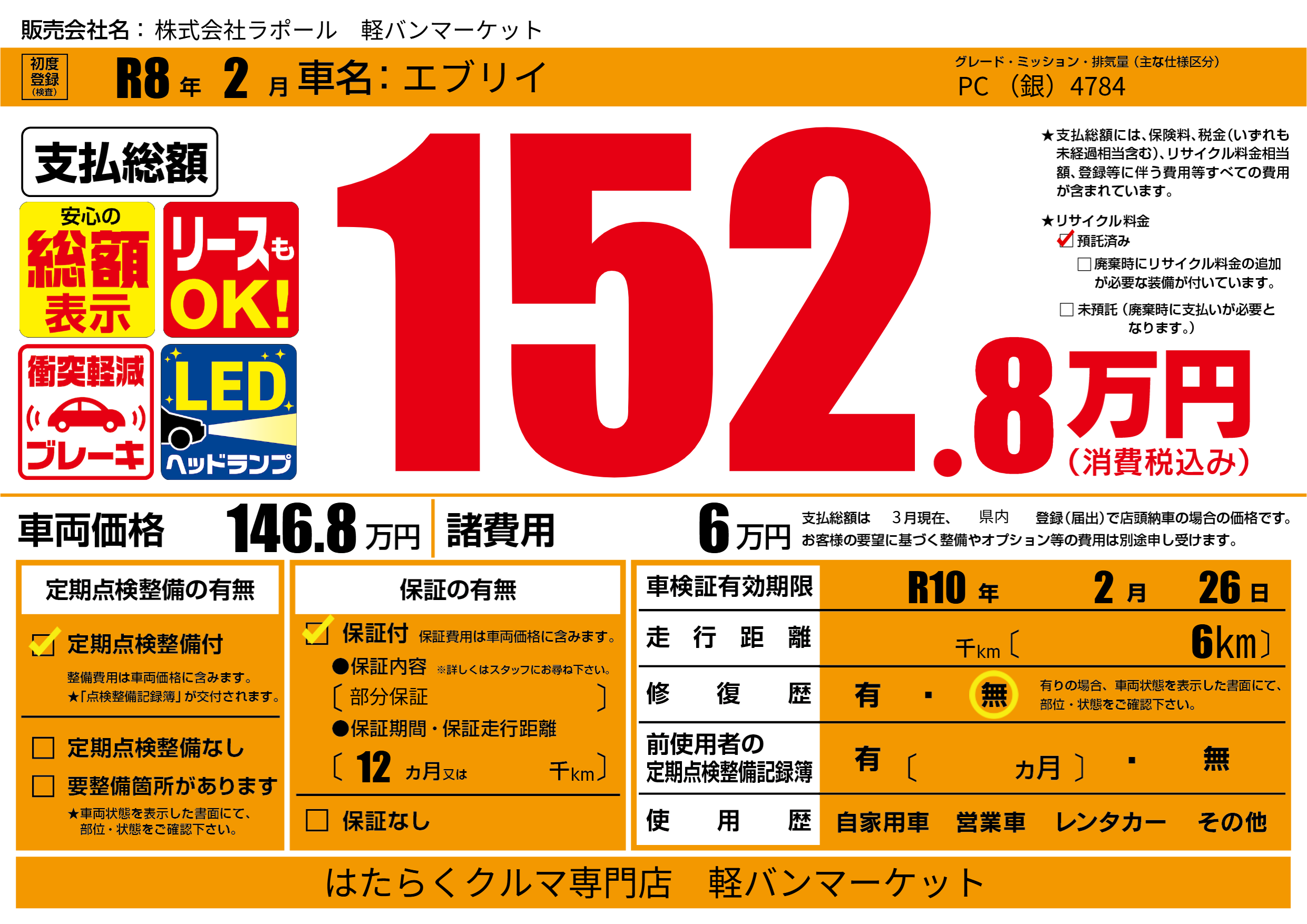 なし | 車検制限 | R10年2月26月 |