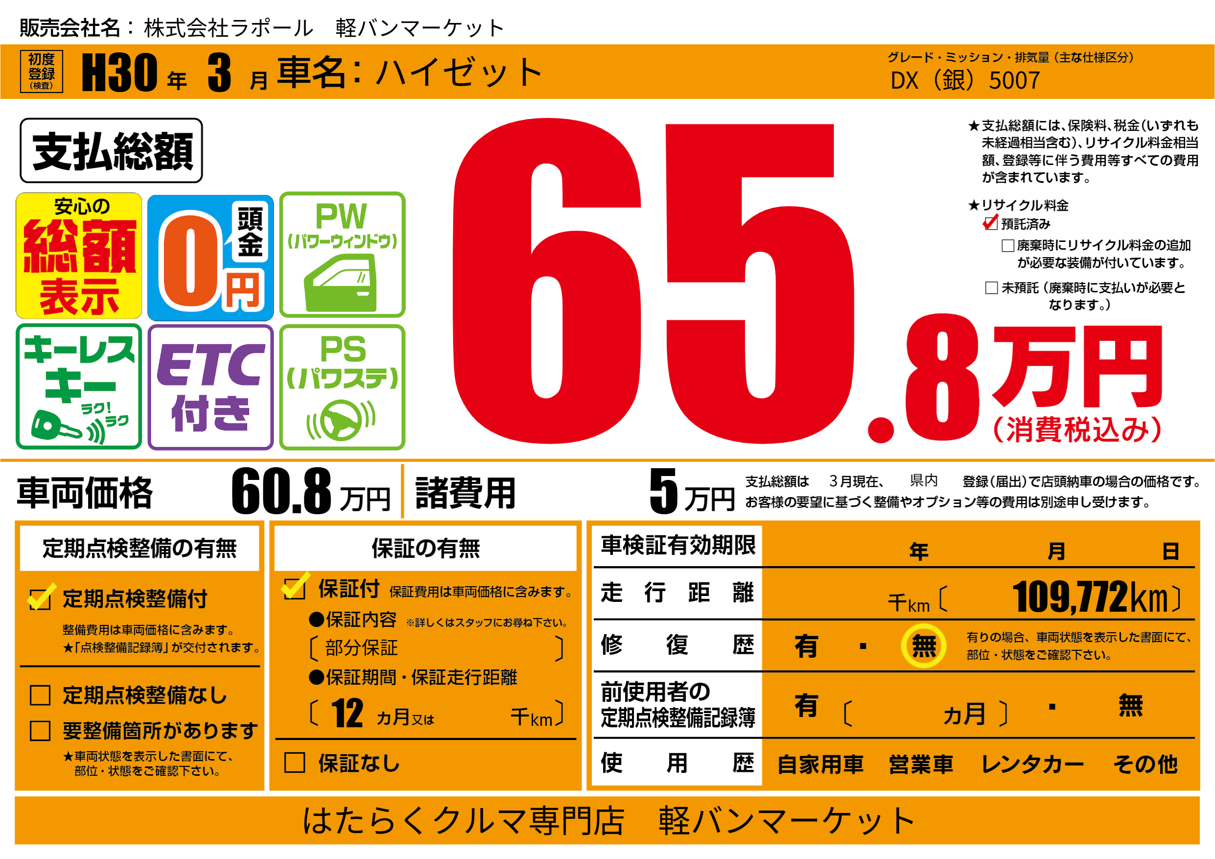 | 車名 | ハイゼット | グレード ミッション 排気量 |