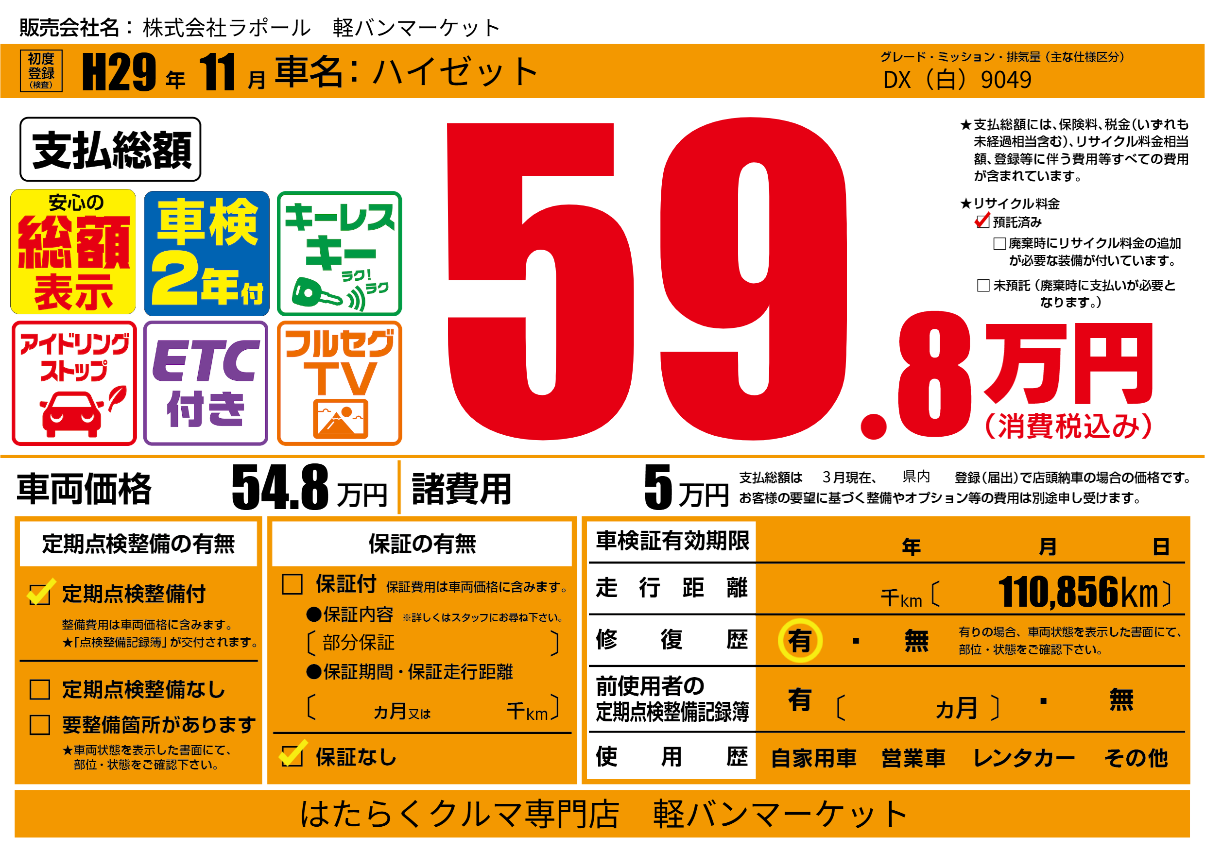 | 車名 | ハイゼット | グレード ミッション 排気量 |