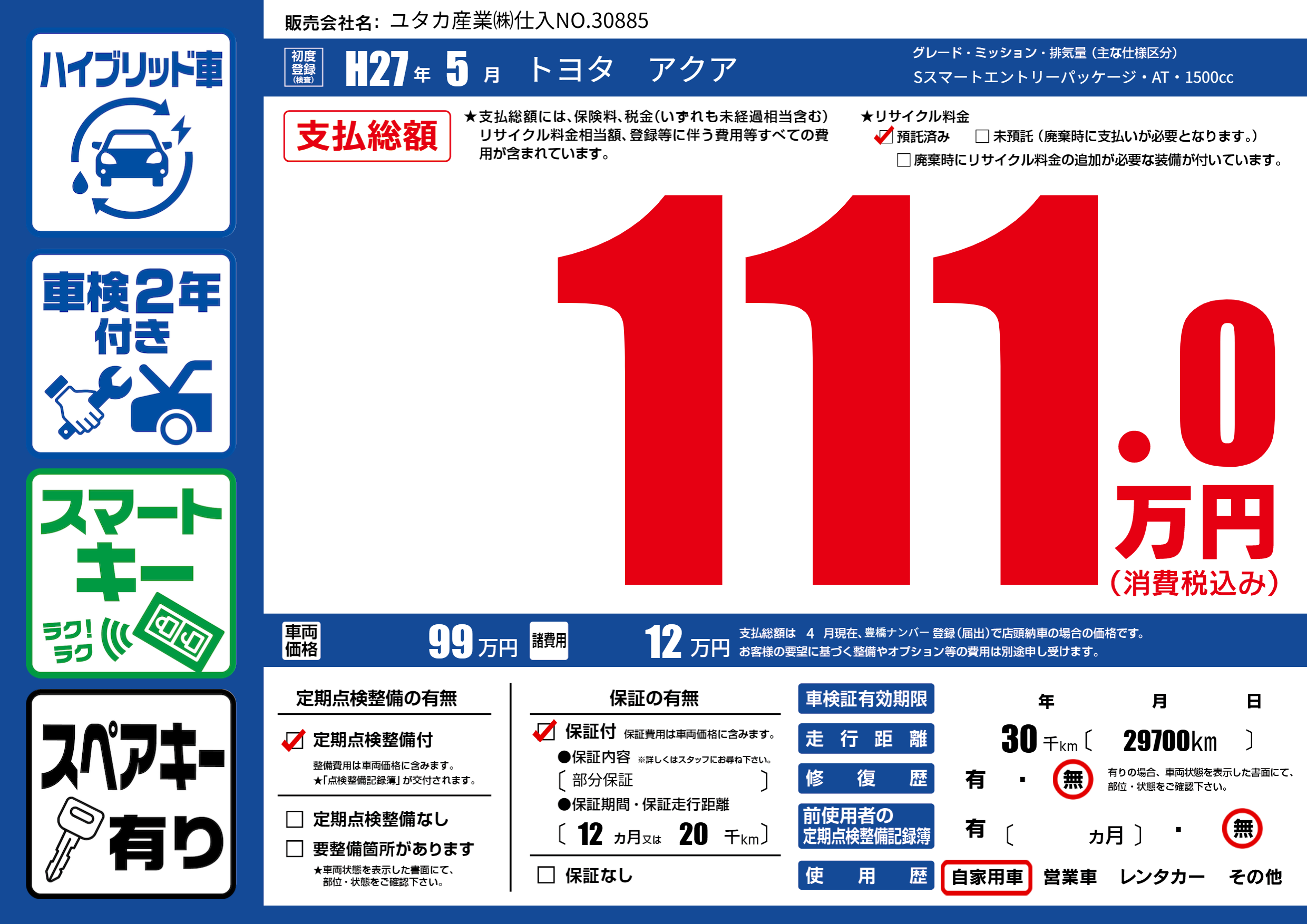 | 走行キロ | 3万km | 初年度登録 | H27年5月 |
